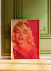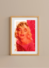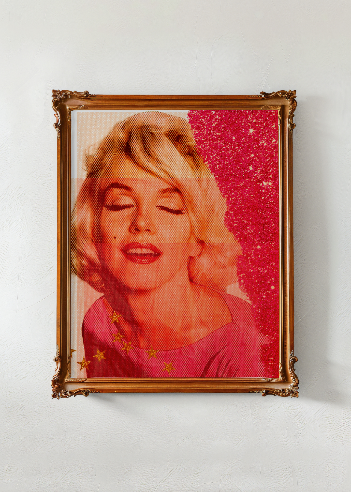Marilyn Monroe— With a smile that could melt diamonds, Marilyn Monroe beams in radiant pink. A glamourous, glittery paper overlay in soft pink adds to the playful and vintage fantasy. A bold tribute to a woman who shimmered in her softness.