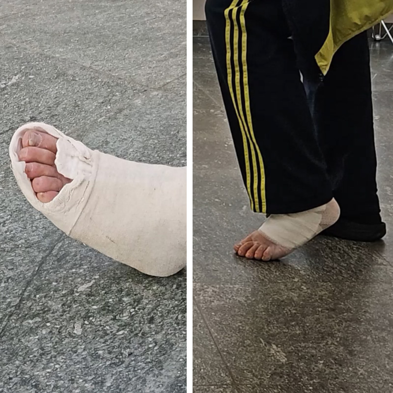 Leaning his body on his crutches, he tries not to put any weight on his casted foot. The foot is wrapped in a split SLC, which is typically secured with a white fixation bandage.