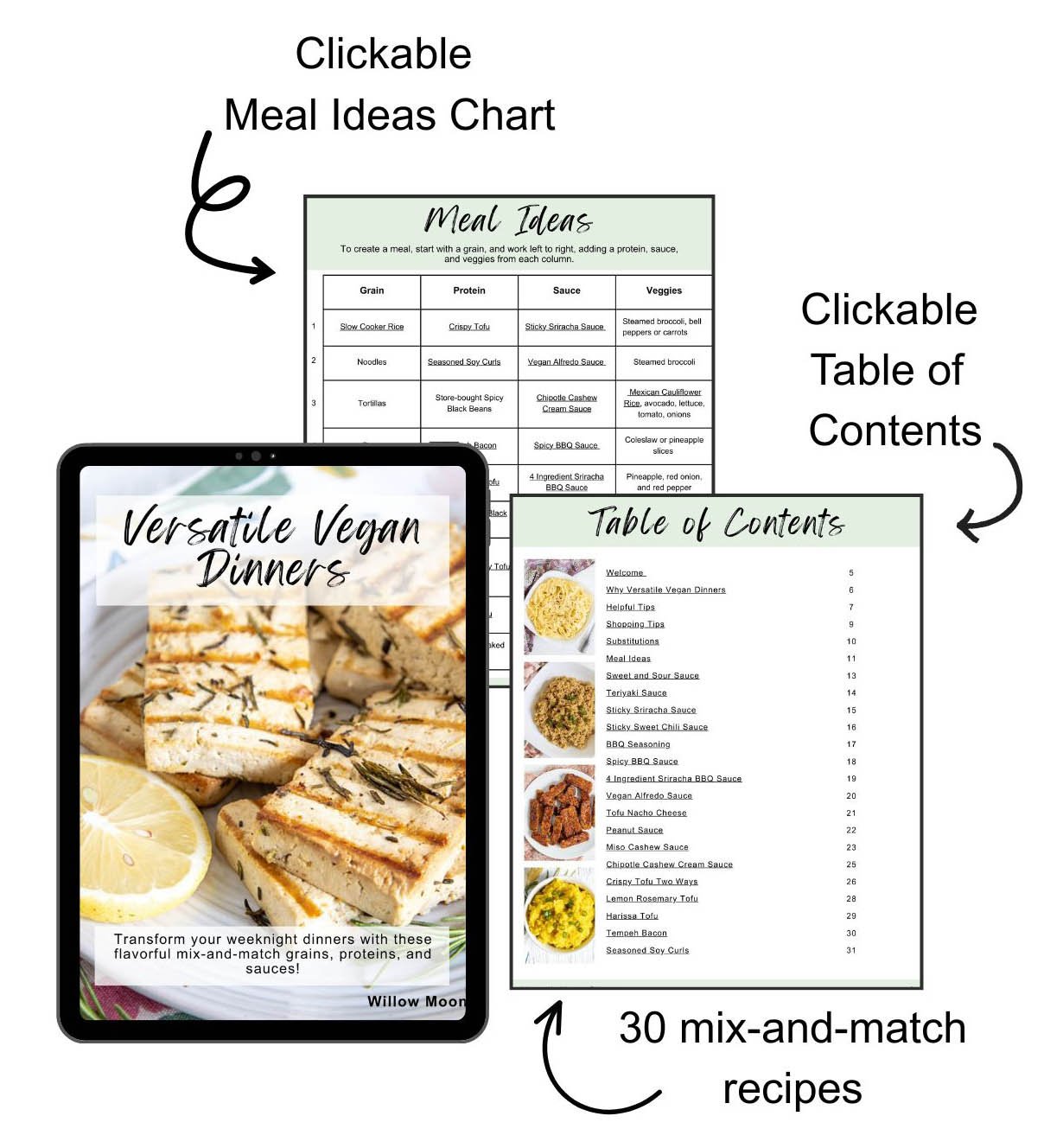 - 30 recipes: Including sauces, proteins, and grains that can be mixed and matched.