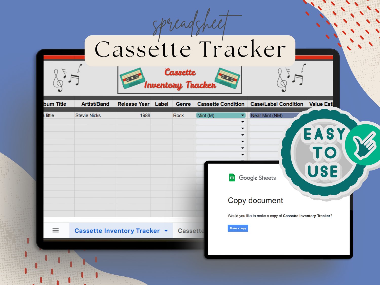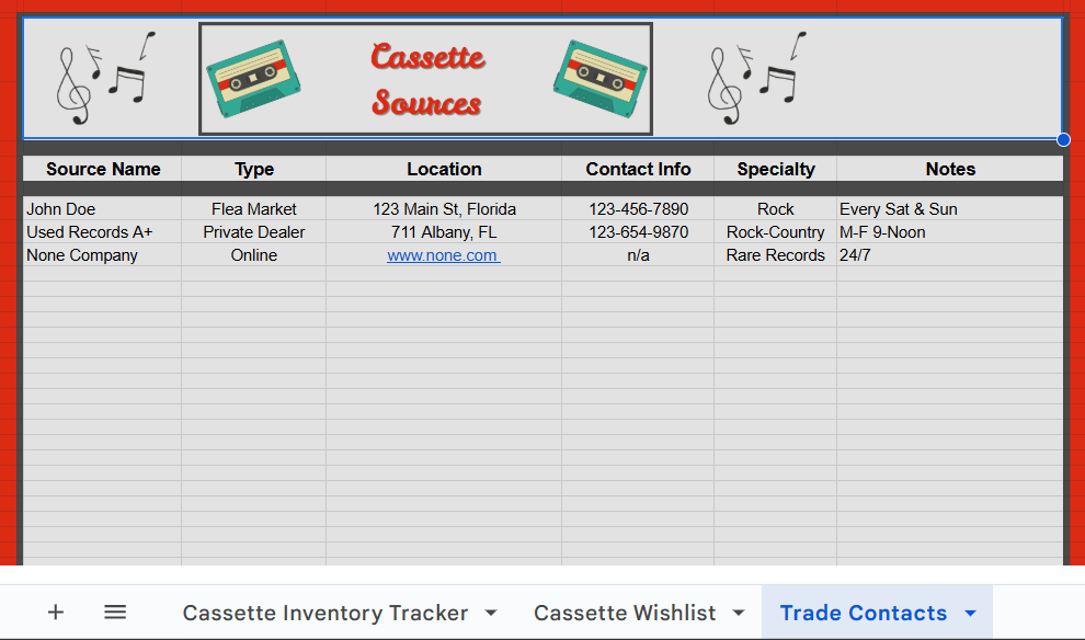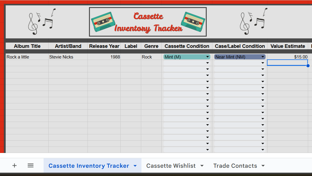 Music Cassette Tracker Spreadsheet | Collector’s Organizer for Albums, Wishlist, Dealers & More