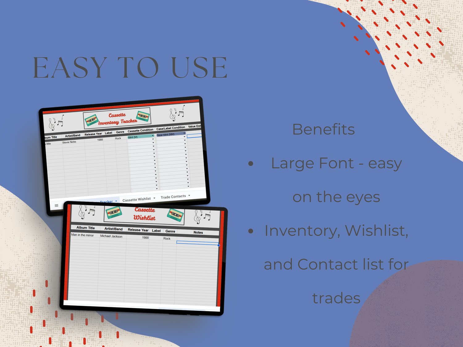 Stay organized, inspired, and in control of your cassette collection. This printable and digital-friendly spreadsheet is designed for collectors of all kinds—from casual crate diggers to serious archivists. Track your cassettes, wishlist, condition, value, and even your favorite dealers—all in one beautifully structured place.
