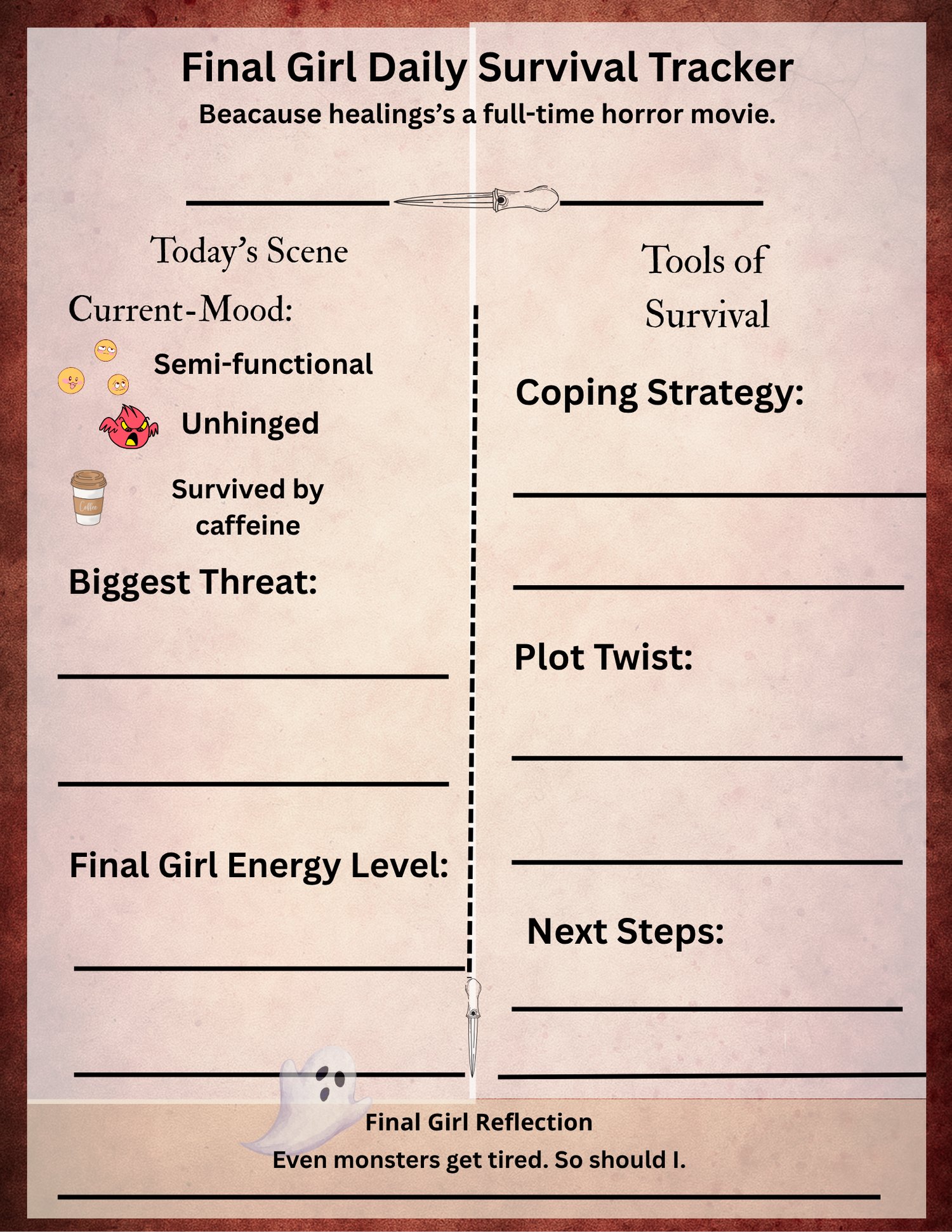 This printable is part of the Final Girl Survival Toolkit, a larger bundle dropping soon — including daily survival trackers, affirmations, and self-care checklists for your inner scream queen.