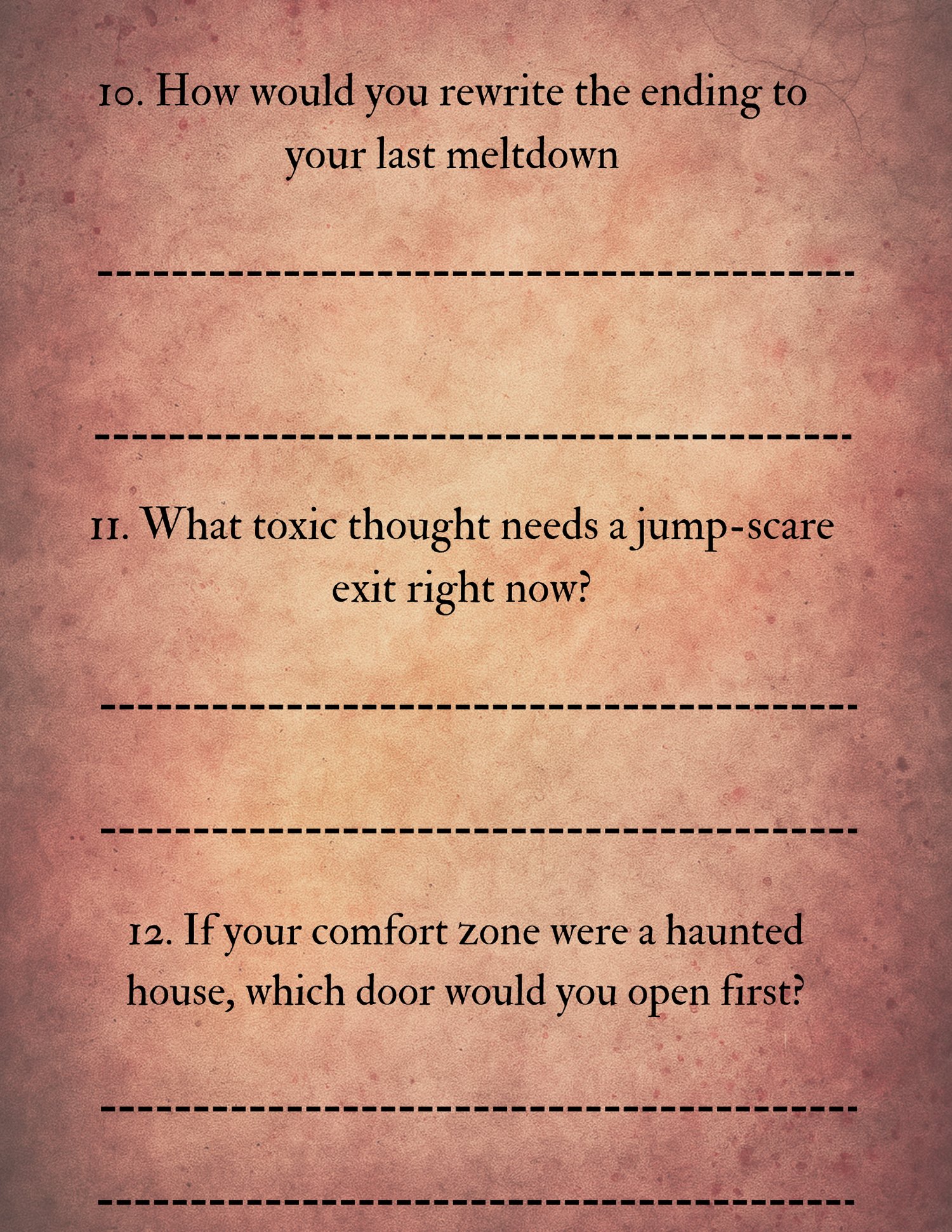 The Final Girl Journal Prompts is a cinematic, horror-humor self-reflection worksheet designed to help you unpack anxiety, panic, and overthinking — without losing your edge.
