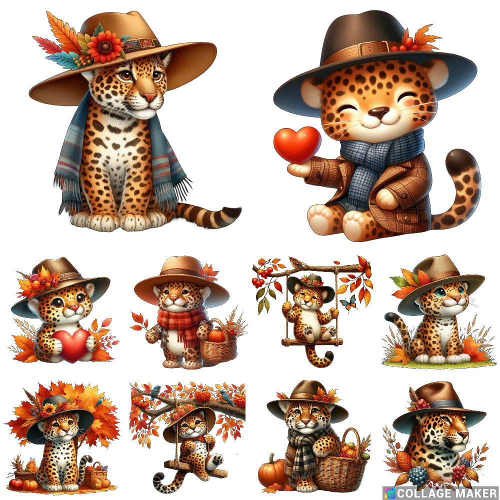 "Bring the wild beauty of the jungle into your autumn-themed projects with this stunning Jaguar Autumn Clipart! This high-quality digital illustration features a majestic jaguar surrounded by vibrant fall leaves, perfect for adding a touch of wildlife to your seasonal designs. Ideal for scrapbooking, T-shirt printing, stickers, and more, this versatile clipart is available for just $1 for 20 images. Enhance your creative projects with this unique and affordable piece of art today!"