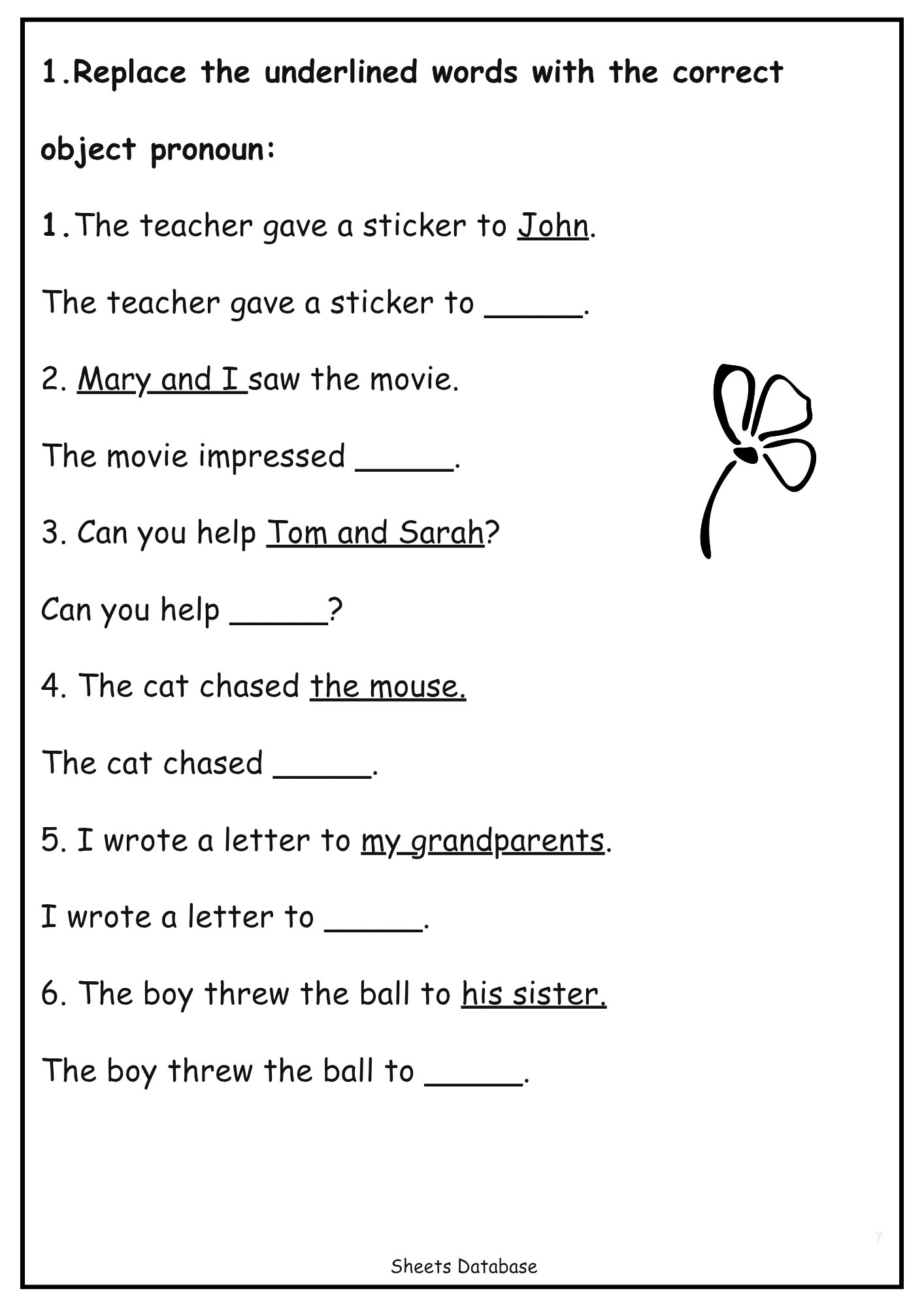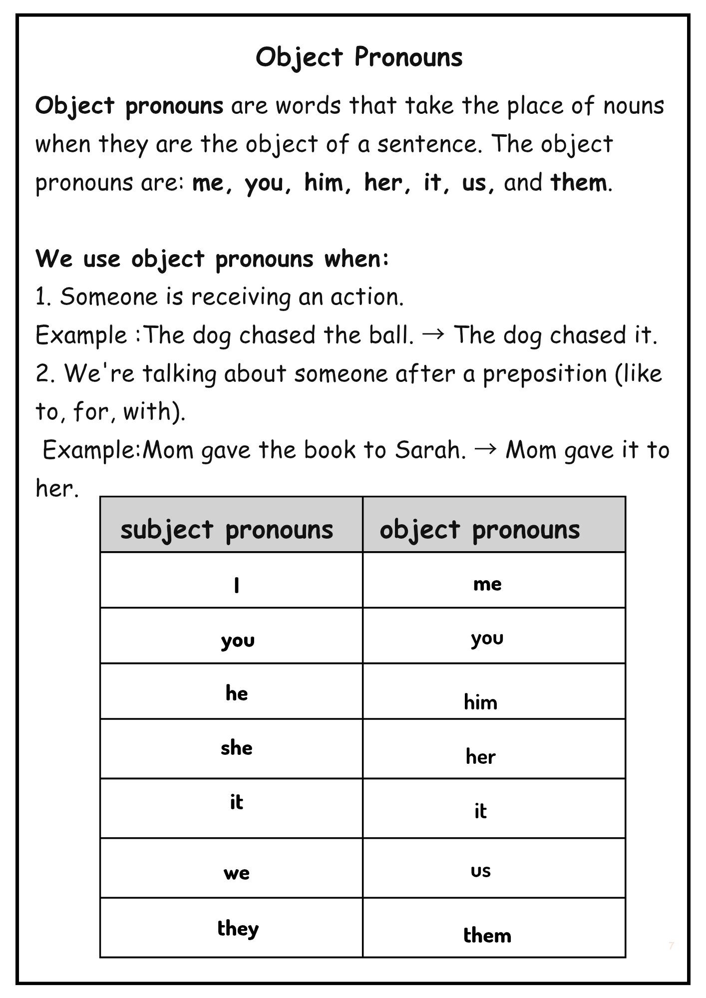 Object Pronouns — (me / him / her / it / us / them) with replacement & rewrite tasks.