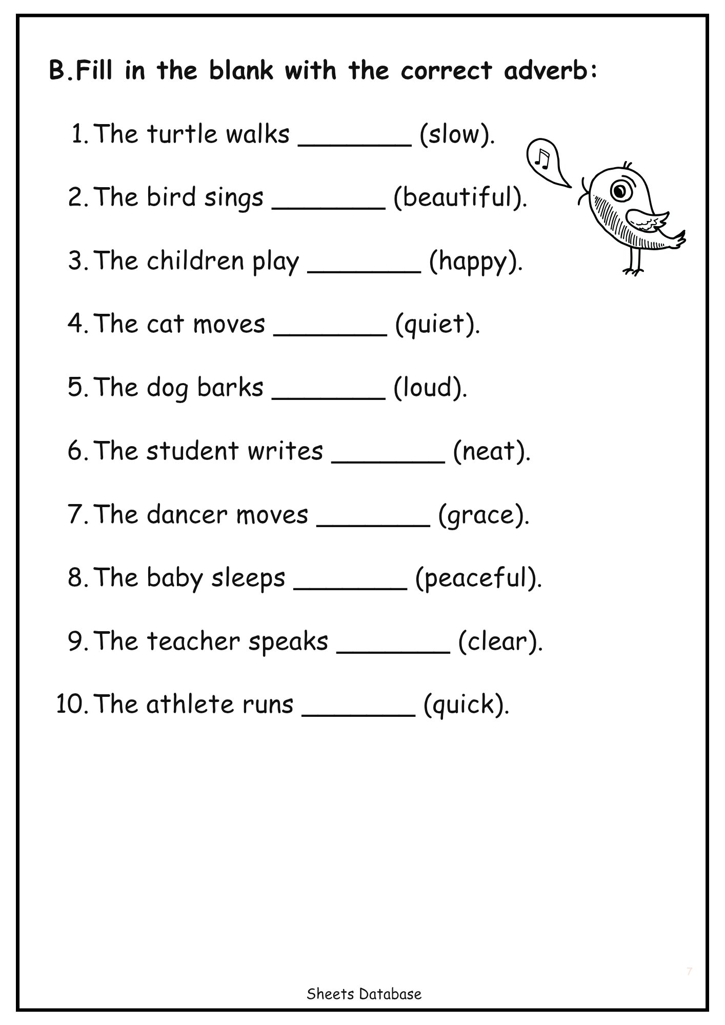 Adverbs — how adverbs work, forming adverbs, and practice sentences.