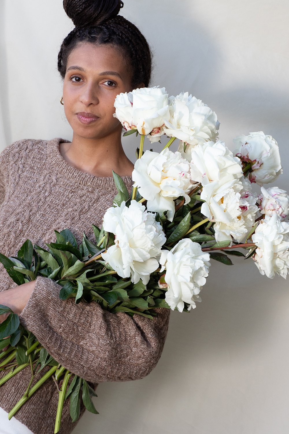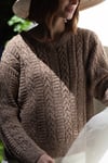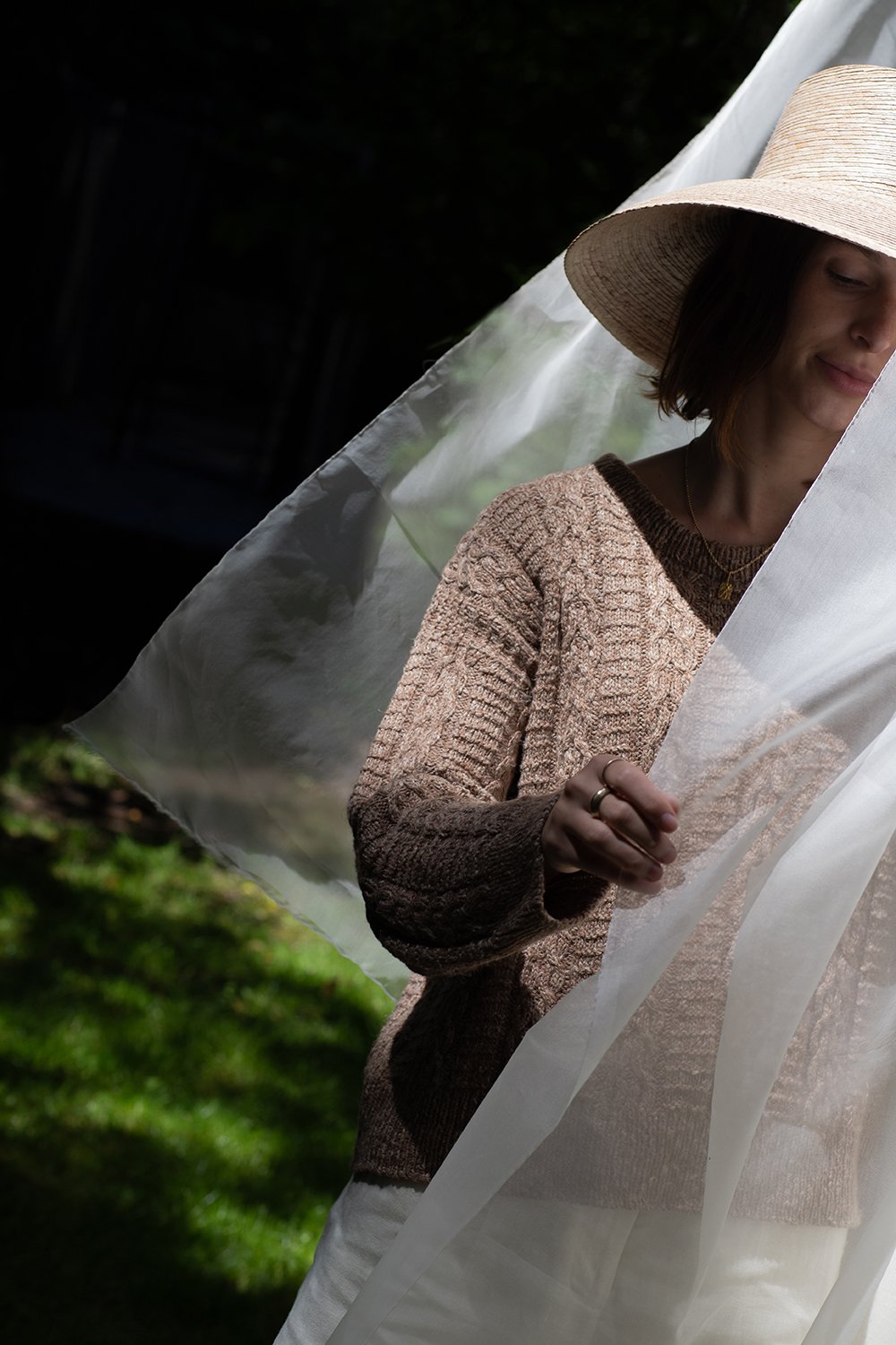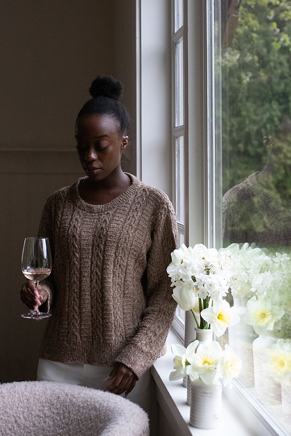 Worked top down starting with the back and front yokes, then joined at underarms, and worked in one piece to hem. Sleeve stitches are picked up around the armhole and worked in the round. The crewneck is worked from picked up stitches around neckline, then folded and seamed to wrong side.