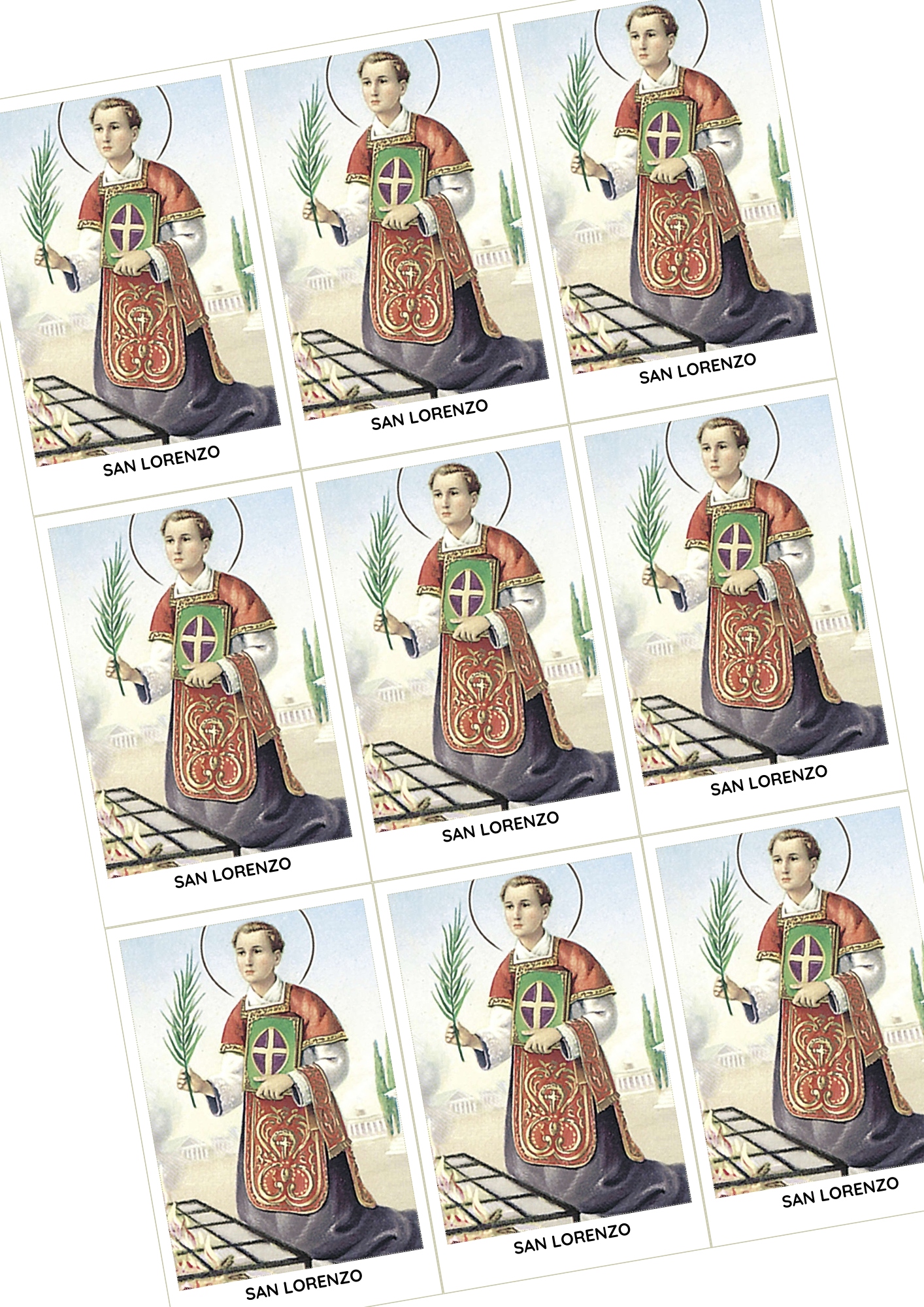 Archivo digital en PDF con estampitas de San Lorenzo listas para imprimir. Incluye imagen del santo y oración en el reverso. Ideal para catequesis, evangelización, parroquias o uso personal.