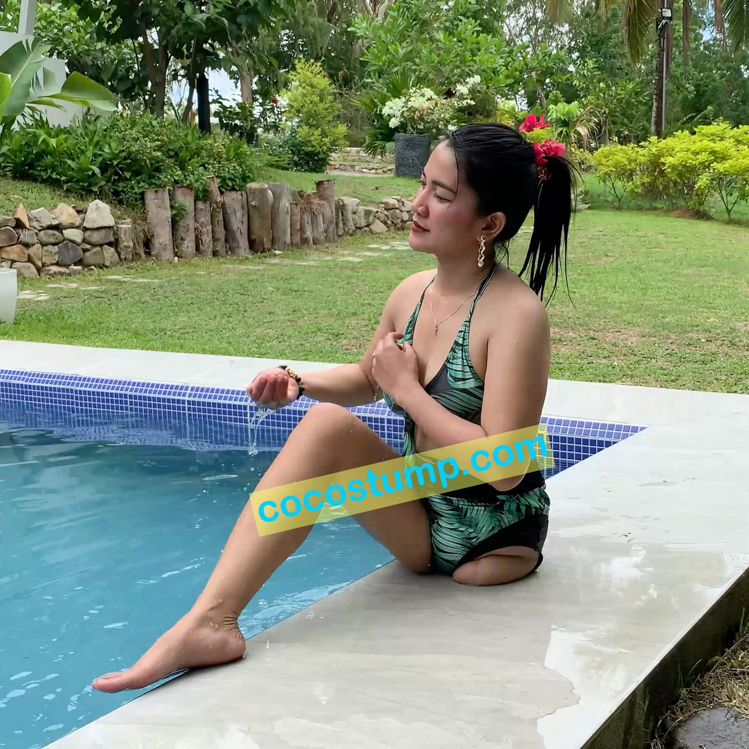 Watch fantastic Megan, wearing a green swimsuit and a high heel. She is crutching to the swimming pool in the garden and she's swimming and posing. Fantastic stump views. 20 min, 2160p.