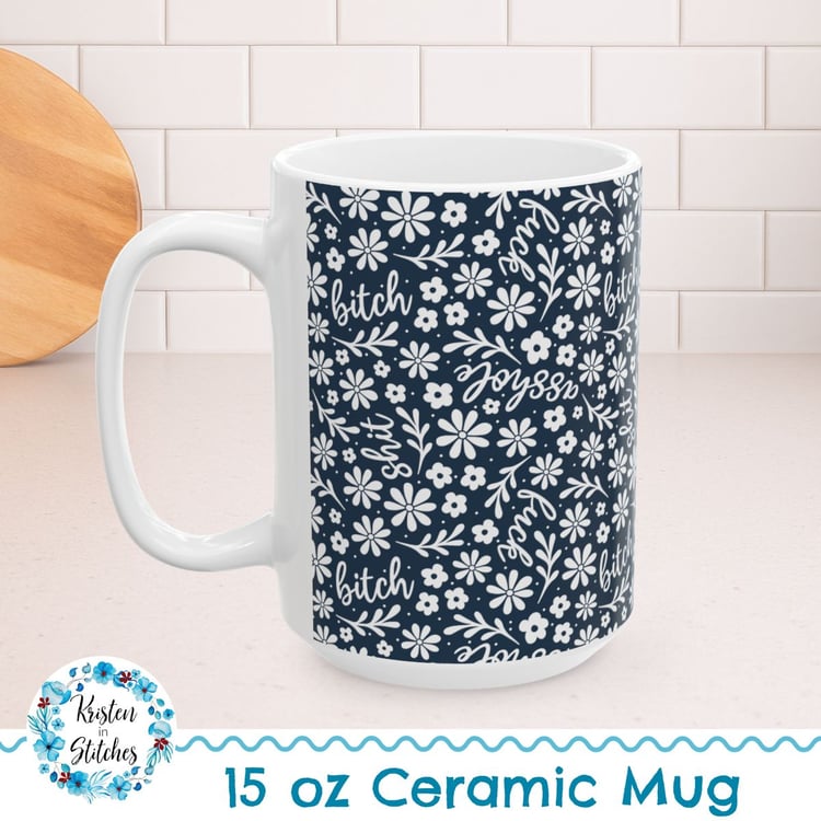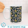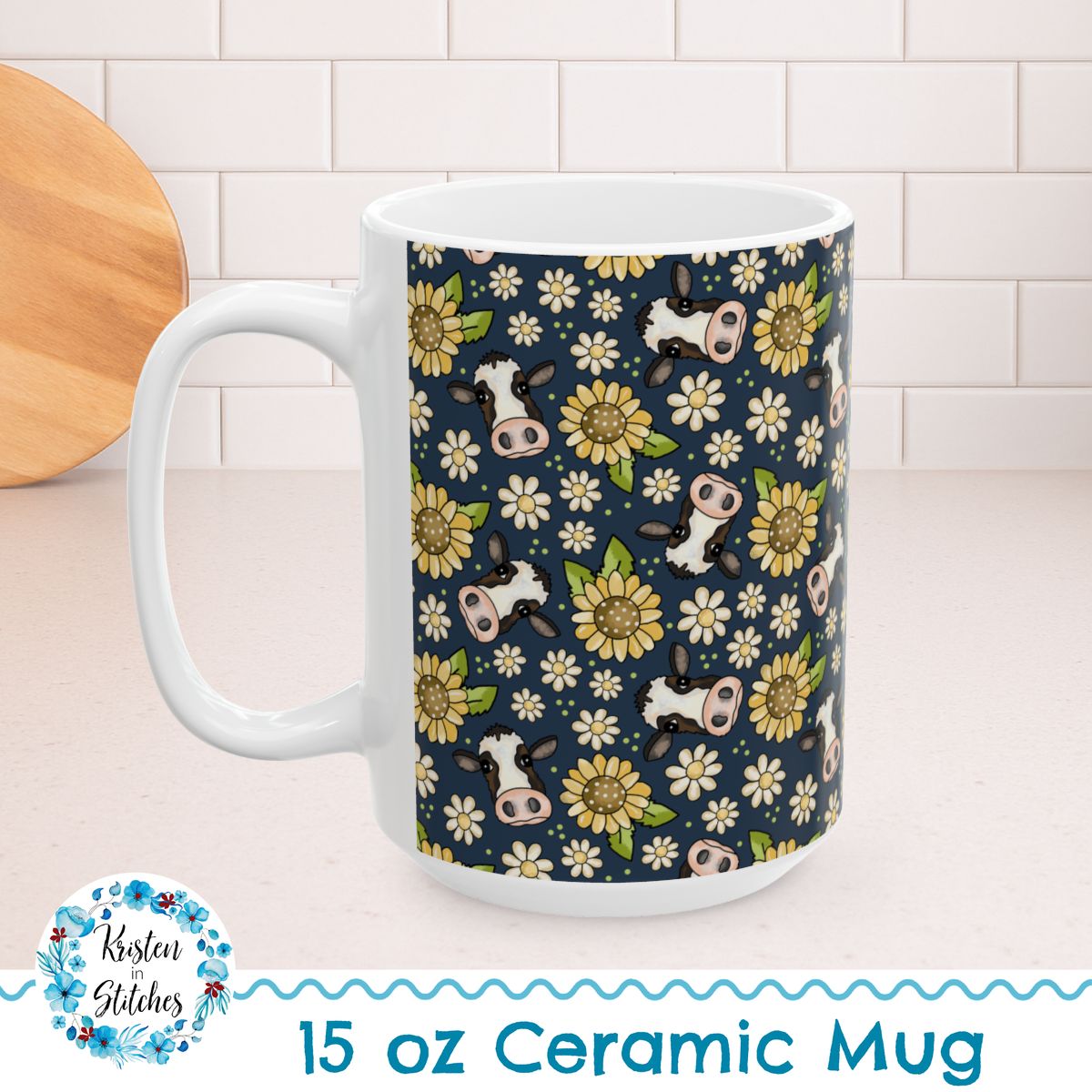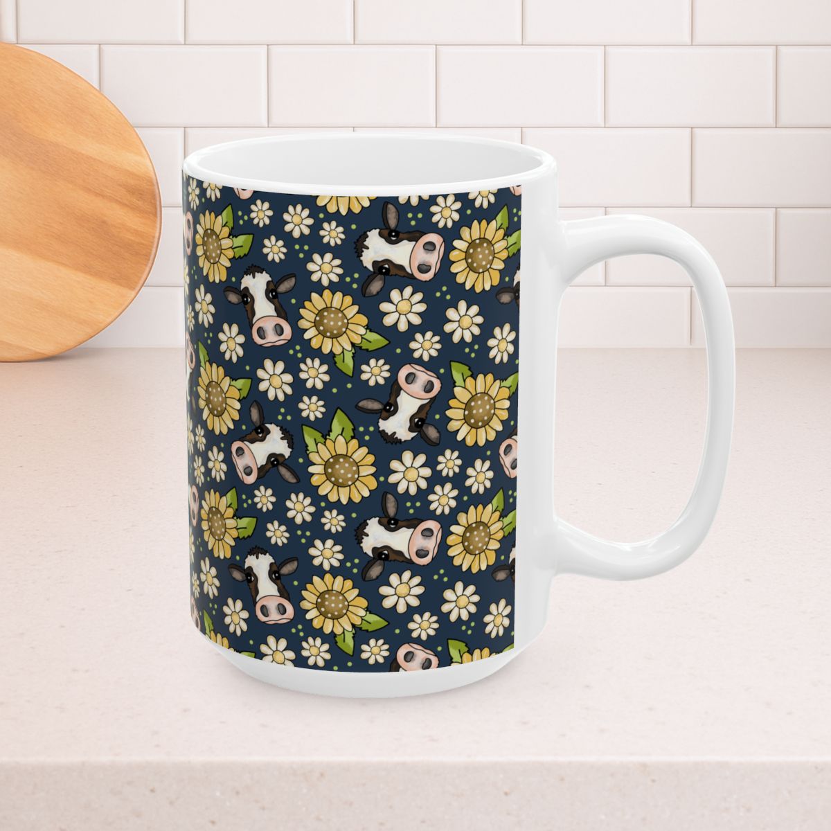 Cows Daisy Flowers Sunflowers 15oz Ceramic Mug, Large Coffee Cup, Navy