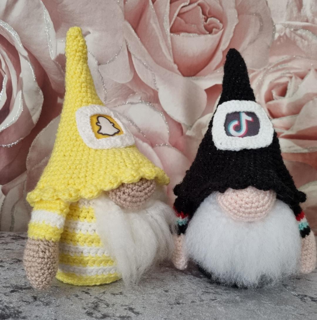 We would like to introduce to you 'The Social Gnomes' here we have the TikTok and Snapchat Gnomes, they are both made in basic stitches and rounds, written in U.S Terminology and stand at approximately 10" in height,