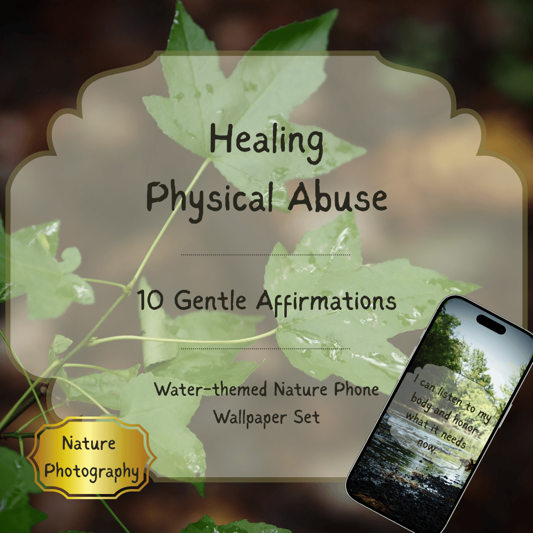This affirmation set pairs 10 supportive affirmations for healing from physical abuse with peaceful water-inspired nature photography. The imagery of water symbolizes renewal, emotional flow, and calm, creating a soothing visual companion for your personal healing journey. Each wallpaper offers a gentle reminder that growth can unfold naturally and that you deserve patience and compassion along the way.