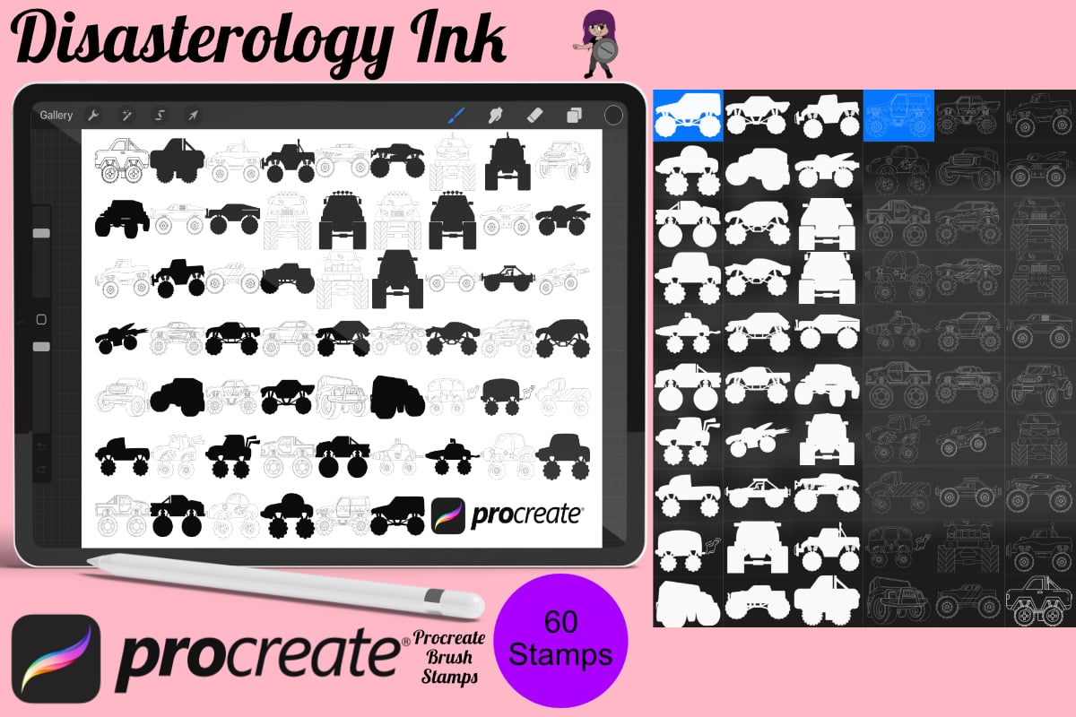 Procreate stamps save time when drawing, saving the effort of having to recreate the same thing for multiple designs and projects, save time on your design by purchasing these monster truck brush stamps so you can utilise that time on creating more beautiful art.