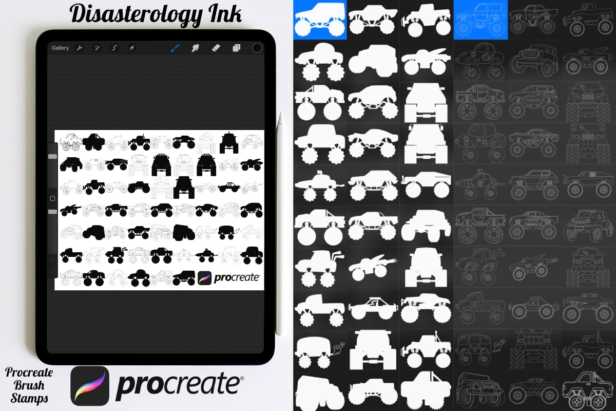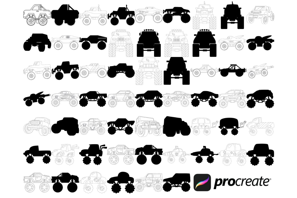 Monster Trucks Outlines & Silhouettes Set 1 Procreate Brush Stamps, 60 Monster Trucks