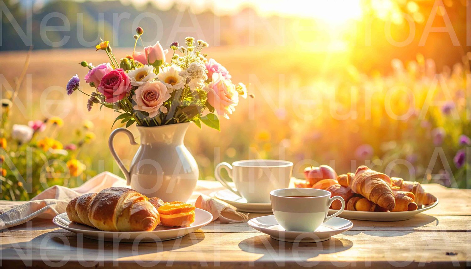 Enjoy a delightful morning with coffee, croissants, and fresh flowers