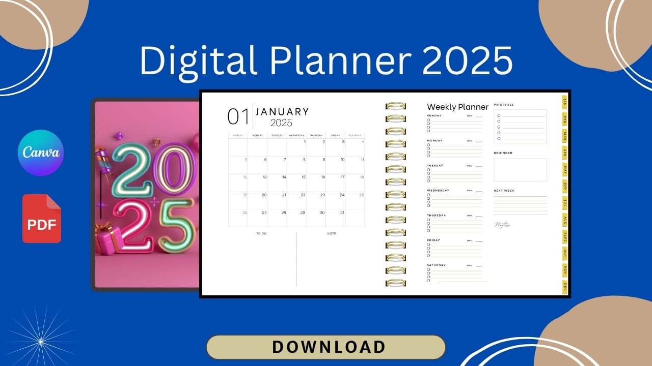 Stay organized, productive, and focused in 2025 with this fully customizable planner. Perfect for students, entrepreneurs, and anyone who wants a clean, easy-to-use planning system.
