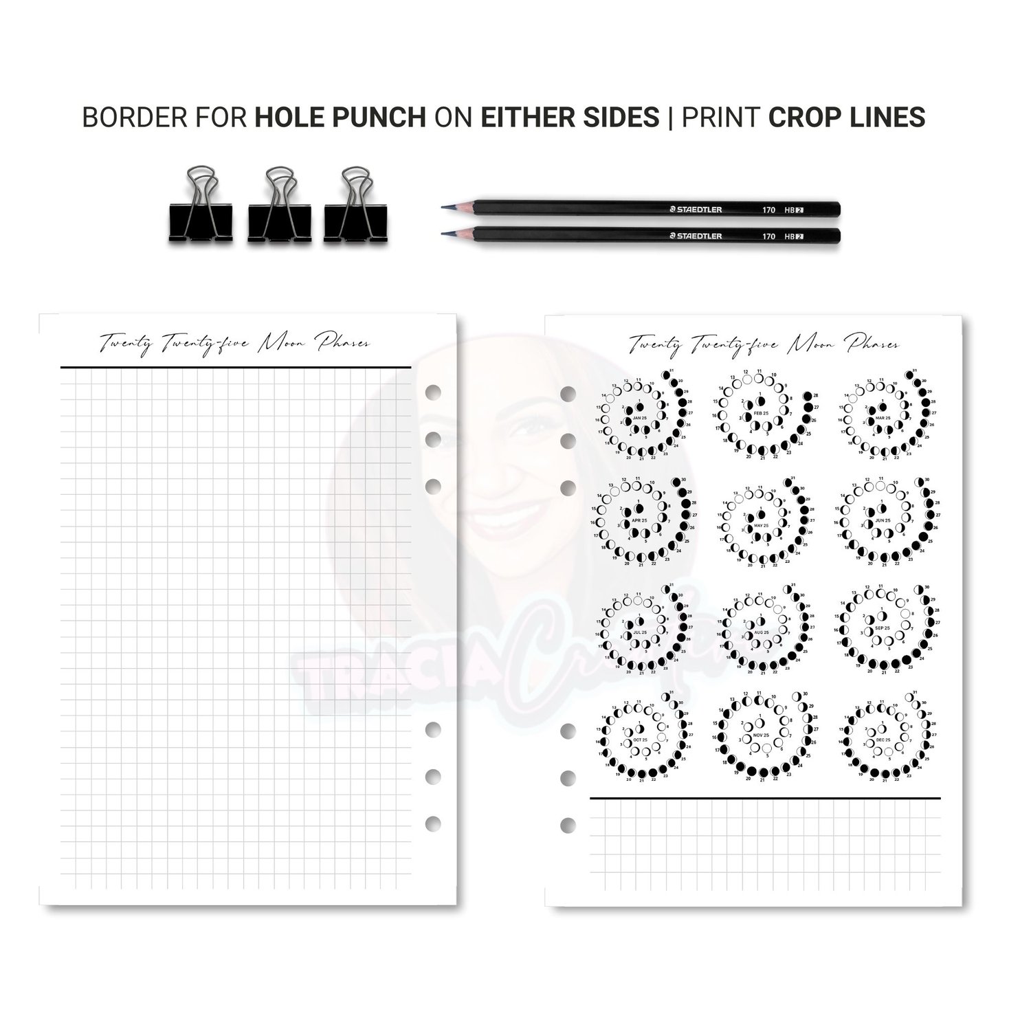 Print the A5 calendar at home or a local print shop. Use it in your planner, hang it on your wall, or keep it on your desk for easy reference. Fill in the notes section with tasks or reflections related to each moon phase.
