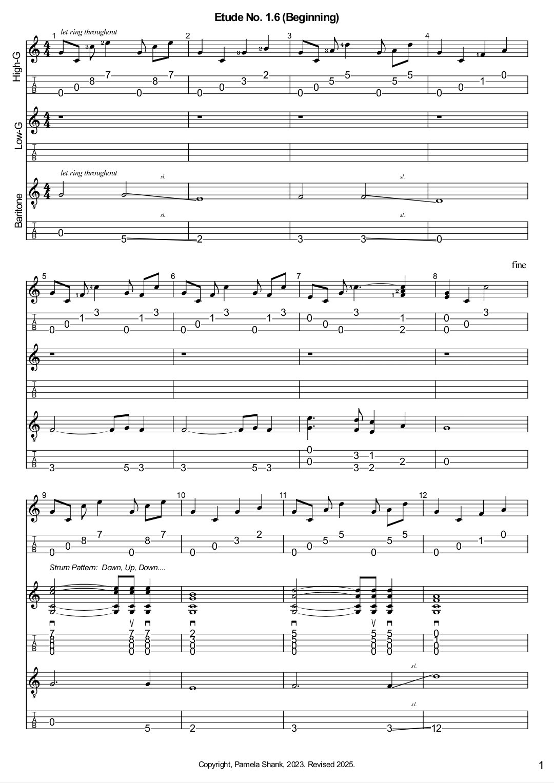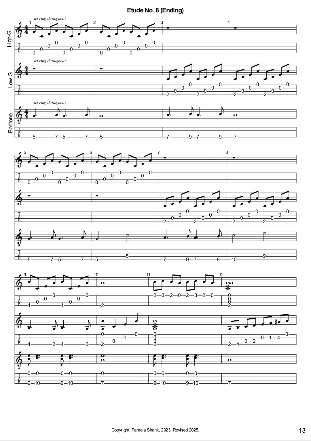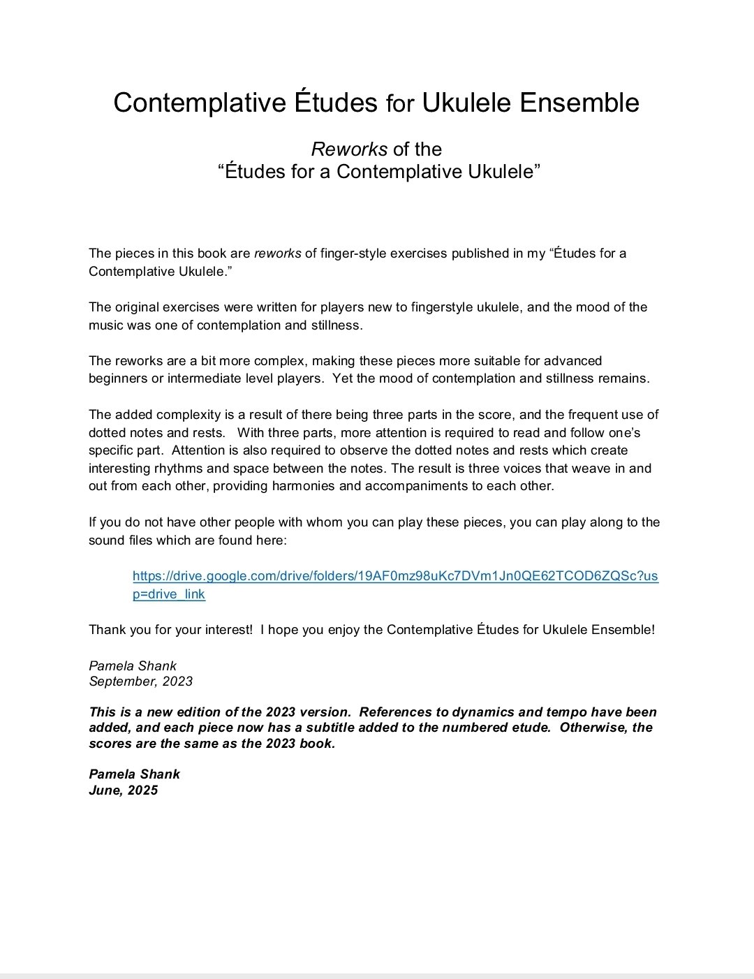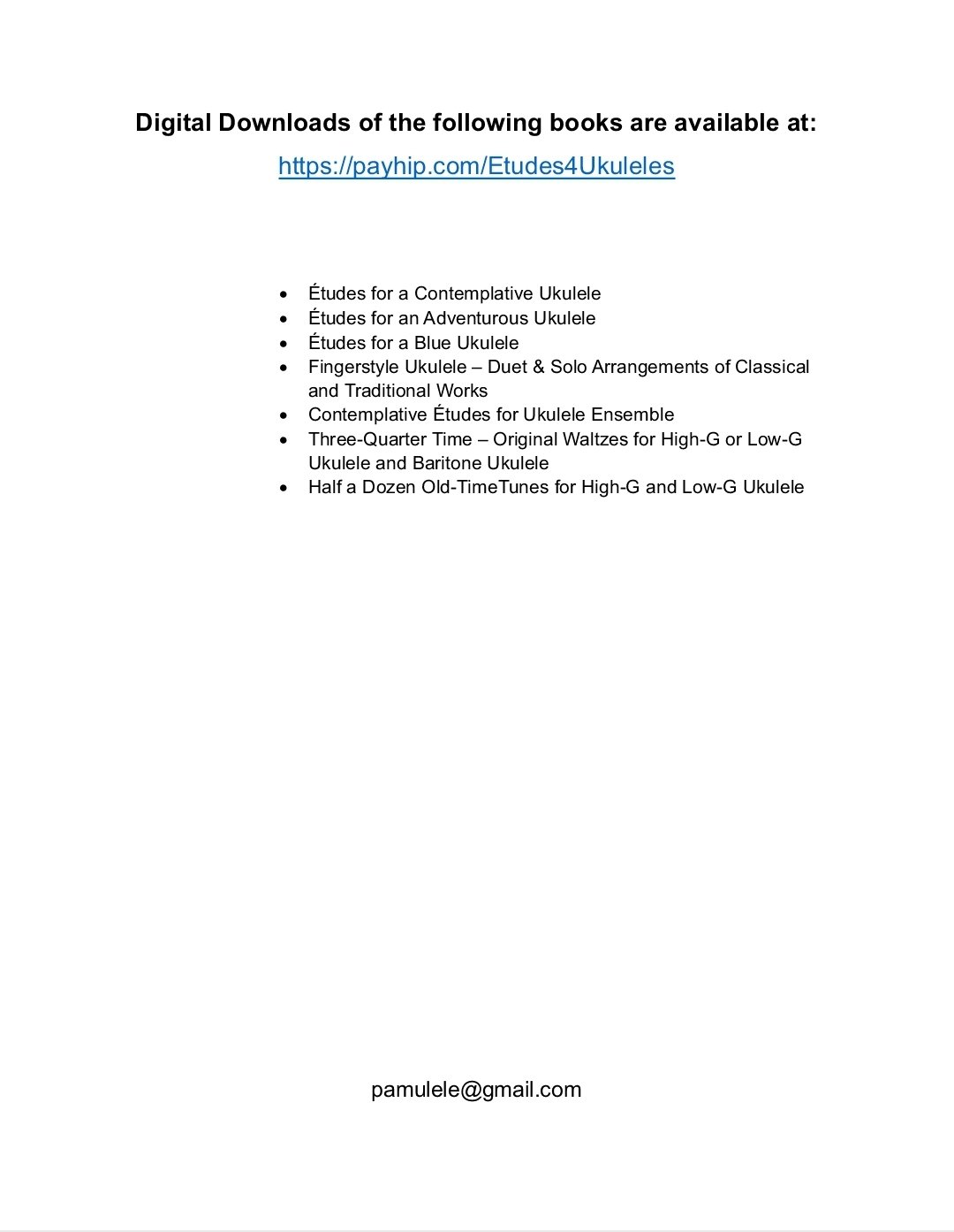 The original Etudes were written for players new to fingerstyle ukulele. These reworks are written for a trio or ensemble (High-G Uke, Low-G Uke, Baritone Uke). (The scores in this revised 2025 version are the same as the scores in the 2023 version, but dynamics and tempo changes have been added - as well as subtitles to each piece's title.) If you do not have other people with whom you can play these pieces, you can play along to the sound files available at the address on the Preface Page of the book!