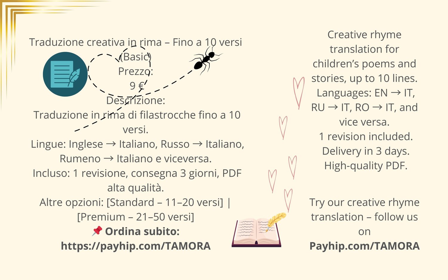 Creo traduzioni in rima fino a 10 versi, mantenendo ritmo, musicalità e significato originale. Perfetta per libri illustrati, progetti educativi, video animati e contenuti per bambini.