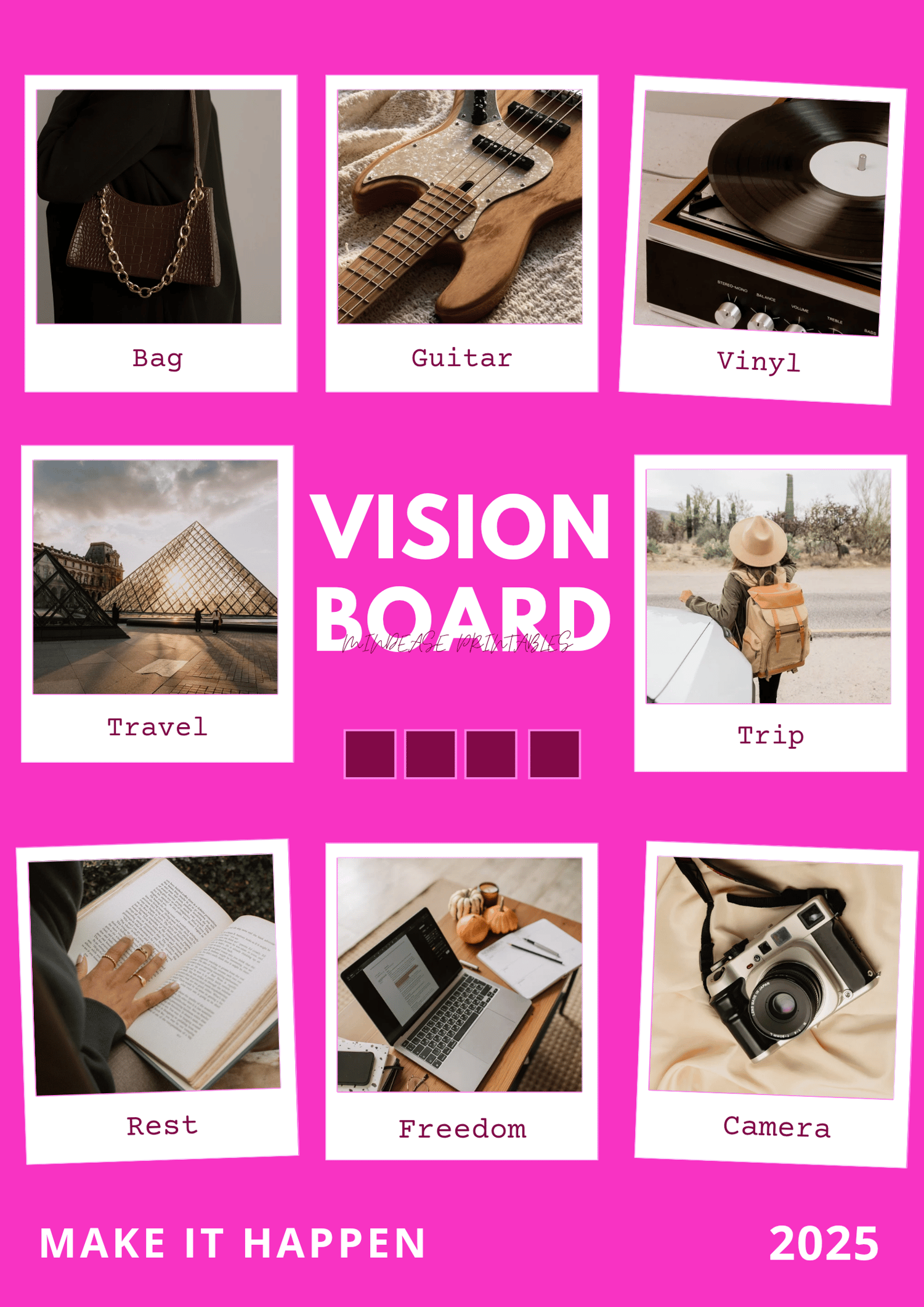 Step into your next level with this bold and stylish 2025 Vision Board Template — designed to help you manifest your dream life with clarity and aesthetic flair. Whether you’re focused on travel, freedom, creativity, rest, or new goals, this vision board brings your intentions to life in a modern, vibrant layout.