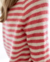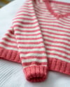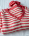 Classic striped sweater with V-neck, raglan sleeves and rolled-up cuffs. The sweater is worked seamlessly from top down. The work begins with the raglan- and V-neck shaping on upper body. Sleeve stitches are then placed on hold and the body is worked in the round towards the hem and finished off with the ribbing. Sleeve stitches are then placed back on the needles and the sleeves are worked in the round towards the cuffs. Long ribbed cuffs can be rolled up for a relaxed and cozy look.
