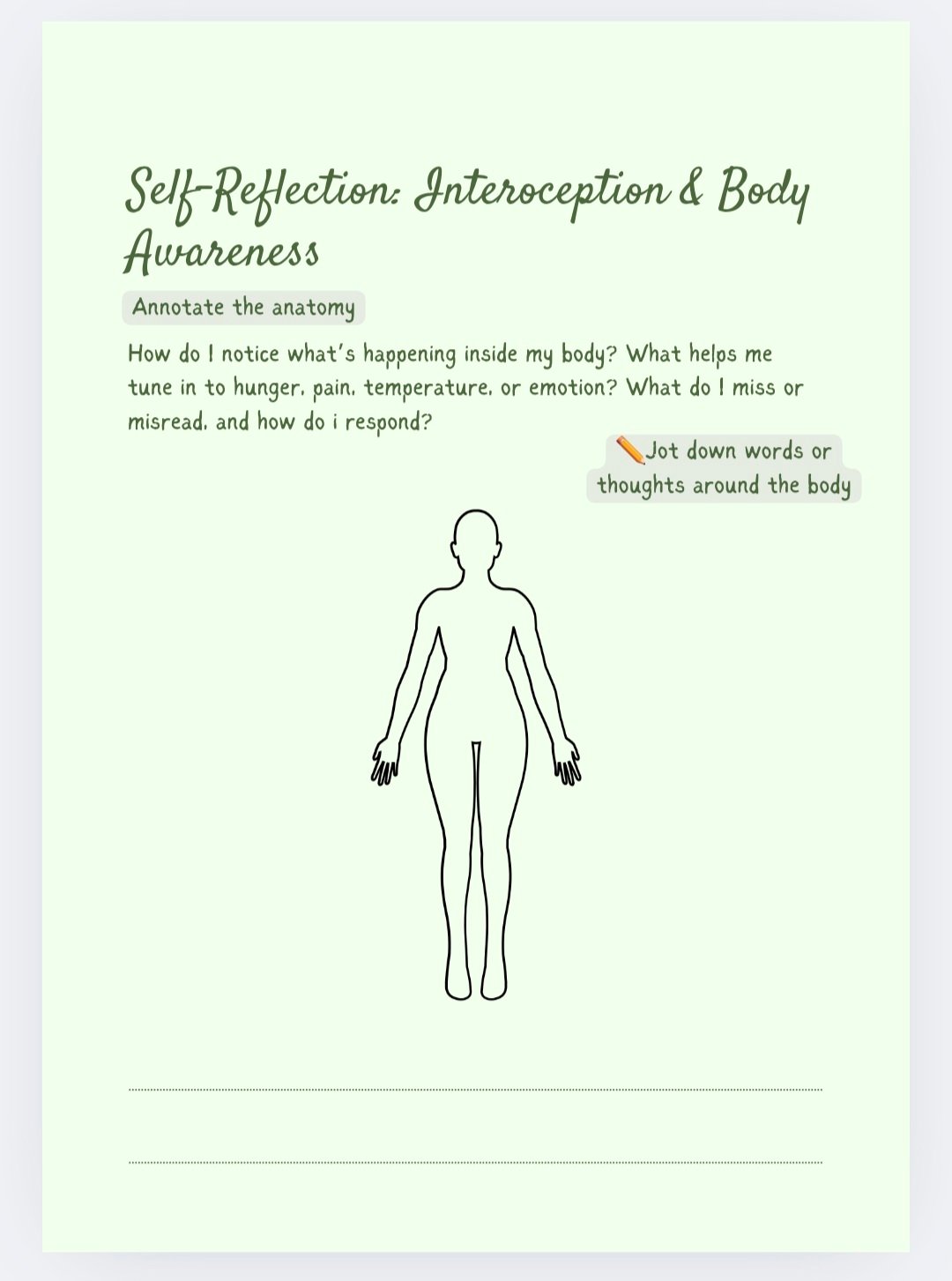 - Space to map feelings in the body, track sensory shifts, and recognise your emotions