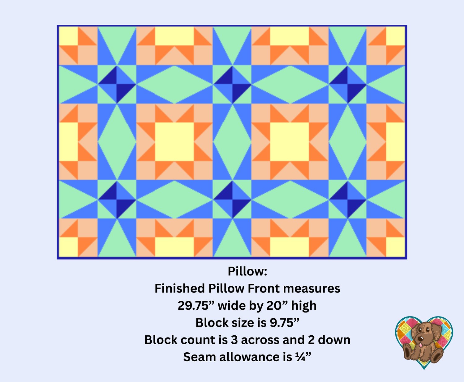 Pillow sham quilt front is 20" X 29.75" Blocks are traditional pieced blocks.