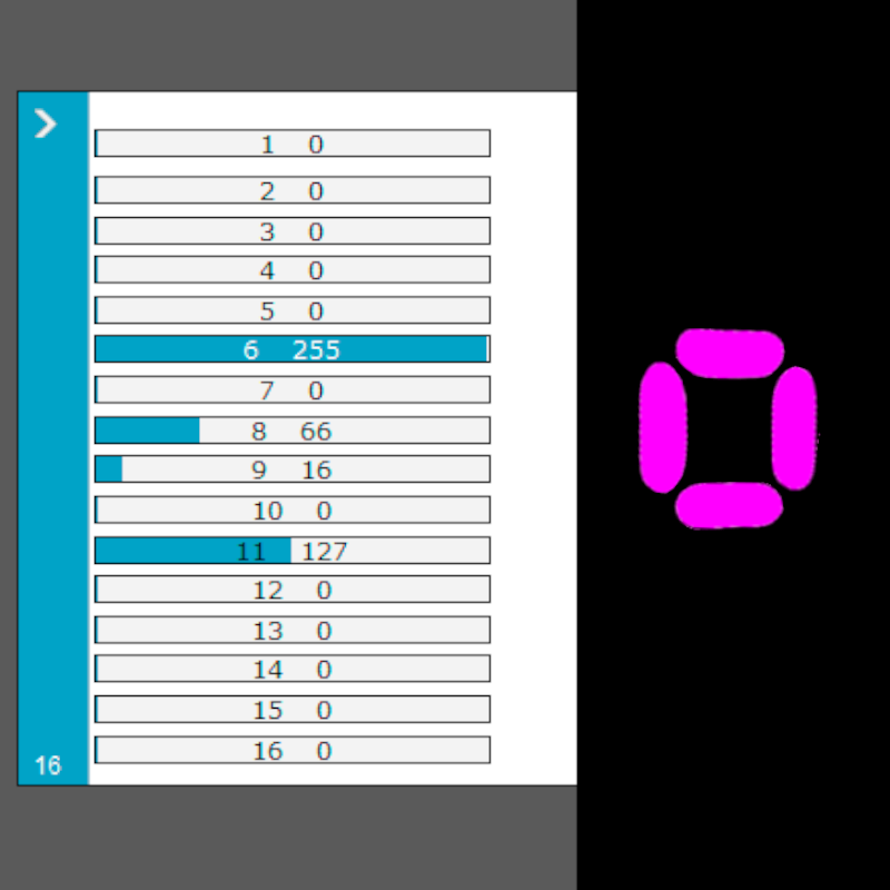 * Verifique, con un Fixture de pruebas (click), que coincidan estos canales: 6 Dimmer, 8 en el valor 66 = Color Magenta, 9 en el valor 40 = Gobo cuadrado, 11 Foco (ver tercer foto).