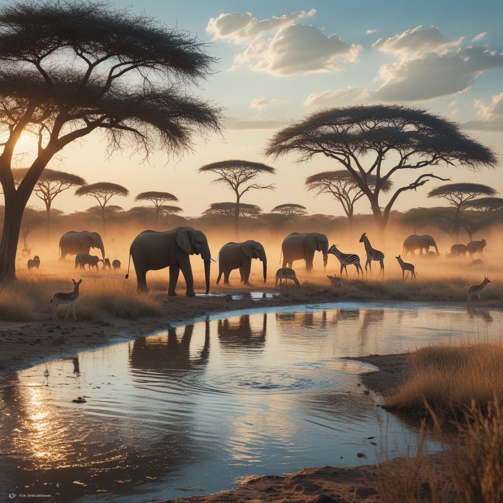 Ultra-realistic wildlife photography style, 8K resolution, high dynamic range, sharp focus, natural color grading, detailed textures in the animals and landscape, shallow depth of field, National Geographic–style composition, peaceful yet powerful African safari mood.