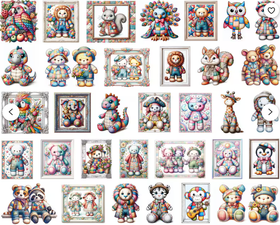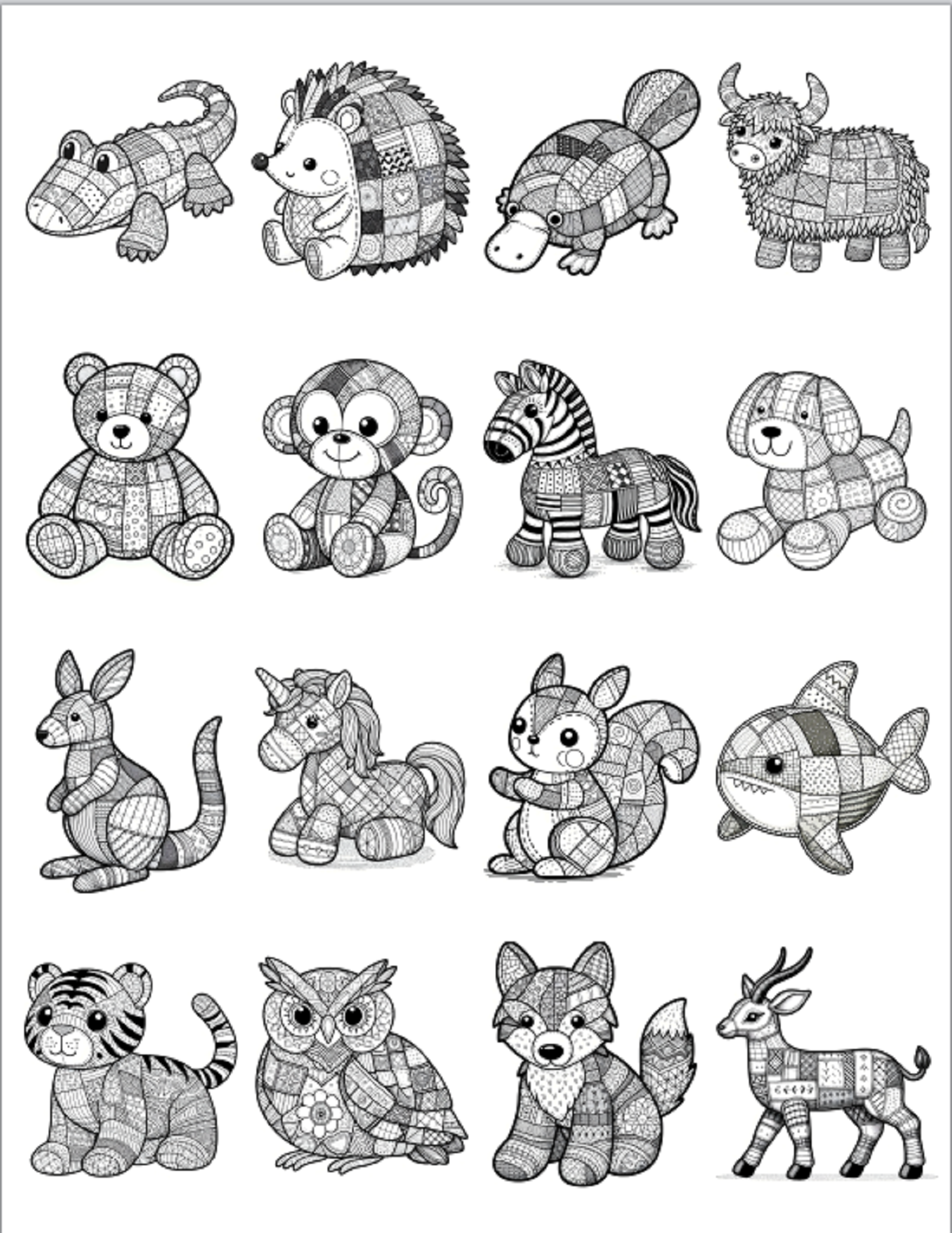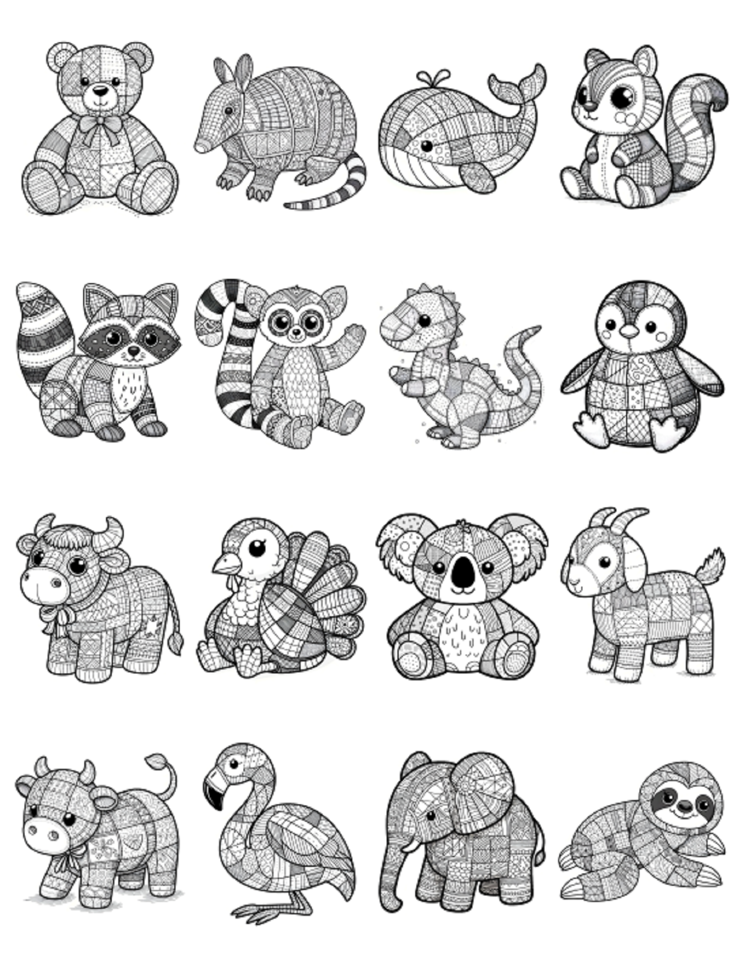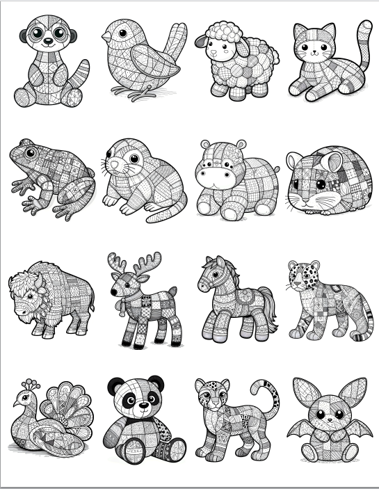🐻🐘🐨 Featuring a menagerie of 16 lovable animals, from cuddly teddy bears to playful penguins, each page is a canvas for your imagination. Our unique patchwork designs combine the coziness of quilts with the charm of your favorite animal friends.