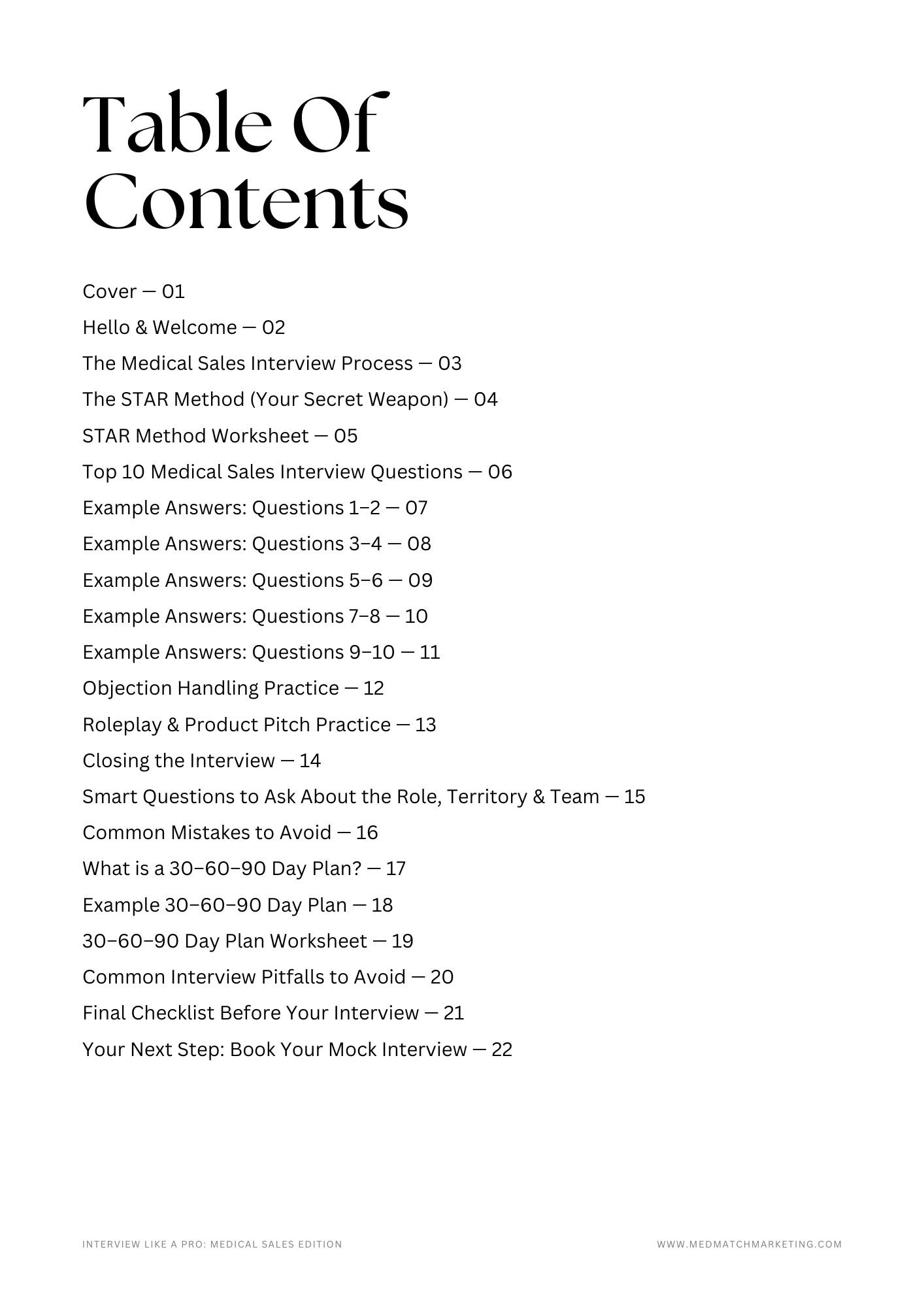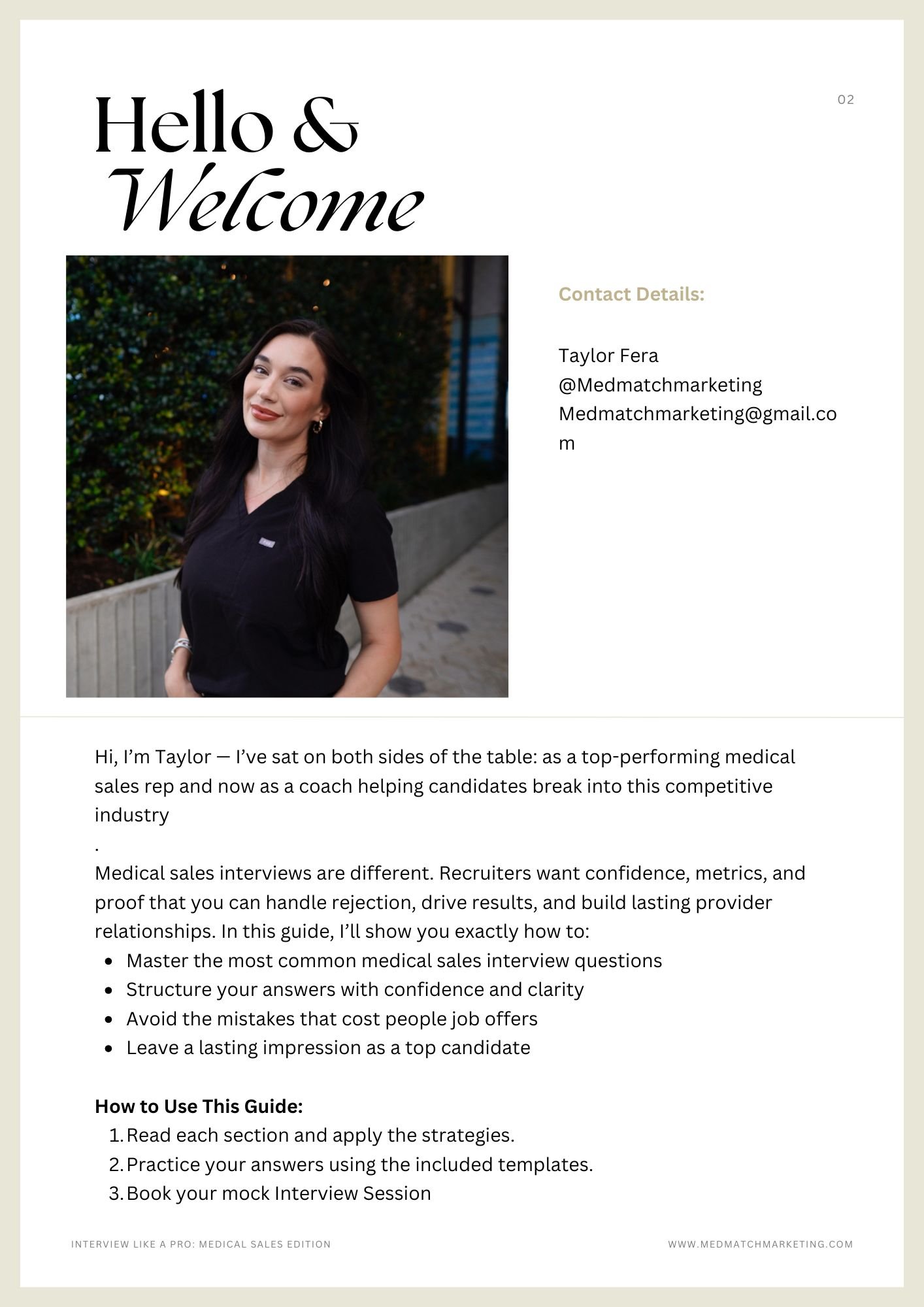 Break into medical sales with confidence. This bundle includes my 20-page Resume Rescue Guide, which comes with a personalized resume review, and my Interview Prep Guide, which includes a live 30-minute mock interview with me. Together, these guides give you the tools to land more interviews and perform like a pro when it counts.