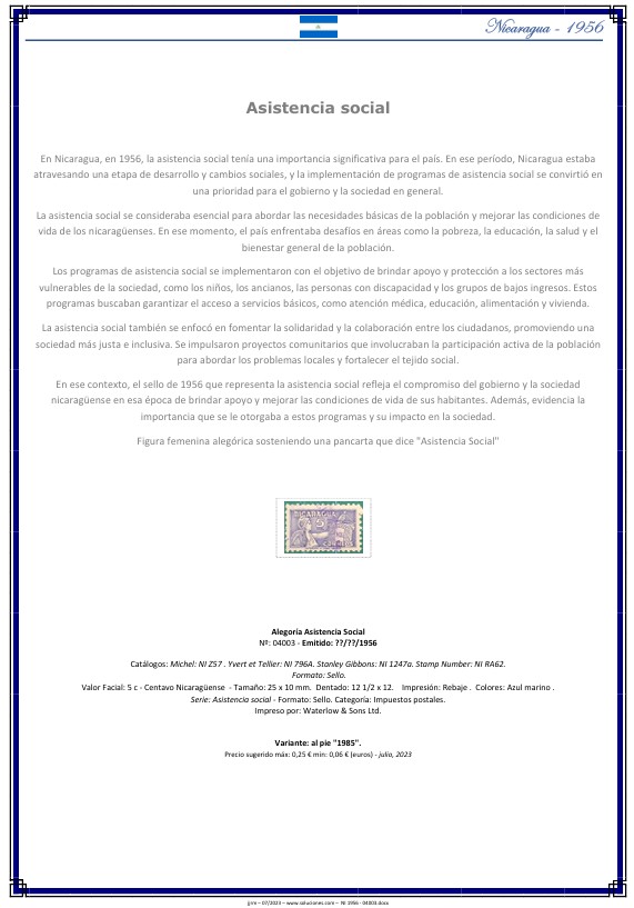 Ficha PDF para sellos: Nicaragua 1956 – Asistencia Social | Código NI 1956 - 04003