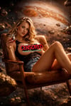 In this surreal cosmic portrait, Samantha sits poised in a deep leather chair as if it were a throne suspended between galaxies. The warm glow of her drink contrasts with the vast, swirling expanse behind her—asteroids drifting past and a colossal gas giant looming like a silent guardian. Her relaxed posture and steady gaze anchor the scene, making her feel like the calm center of an impossible universe.