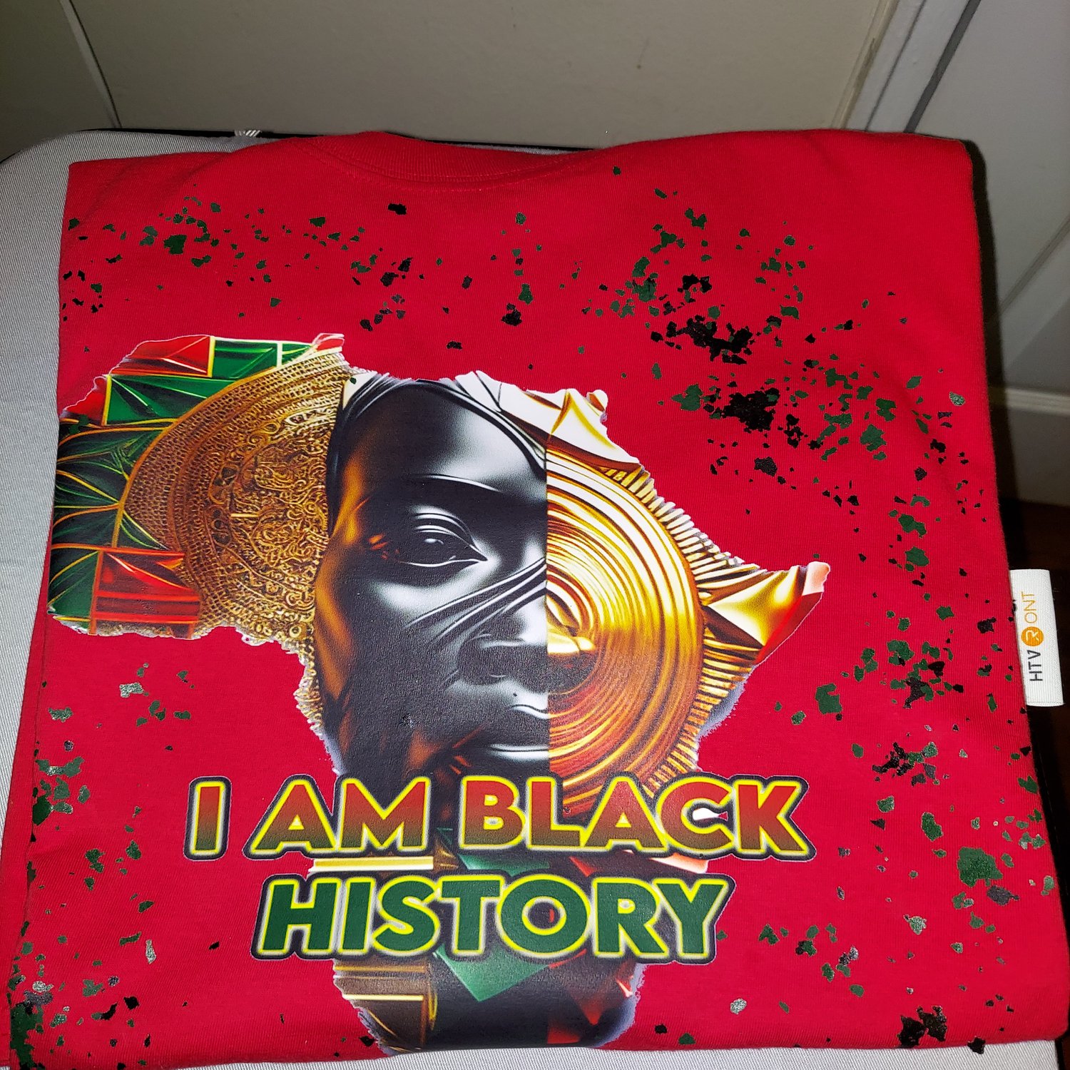 Make a bold statement with this vibrant " I AM Black history" design. Set against a striking red glidan t-shirt, this piece featuring a powerful afrocentris graphic of the African continent with regal golden and black elements symbolizing strength and heritage. The black and brown confetti details add a unique, texture flair,representing unity resilience, and the richness of black culture. Perfect for honoring black history and celebrating identity with pride.