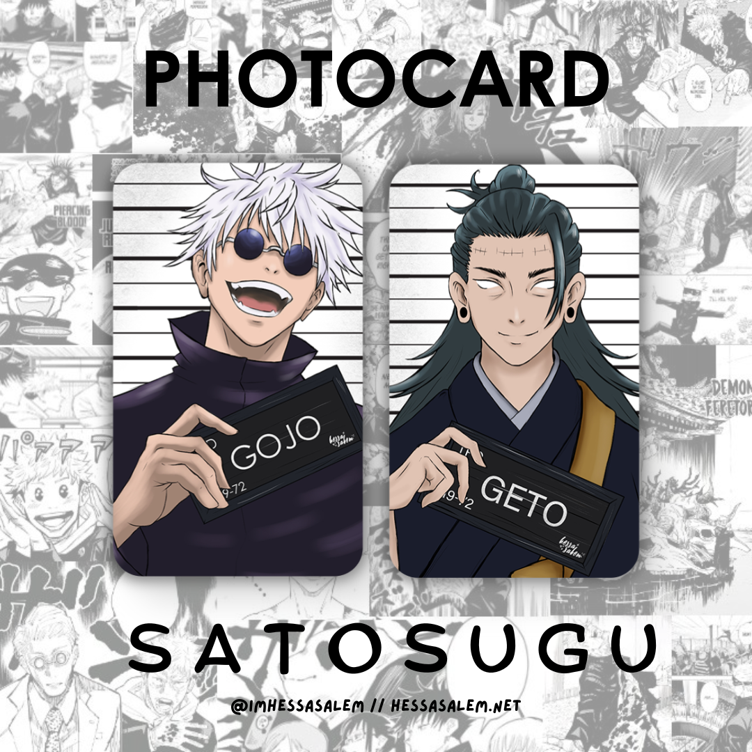 A photo-card print fan-artwork of Gojo and Geto from Jujutsu Kaisen by © HessaSalem.net, 2023.