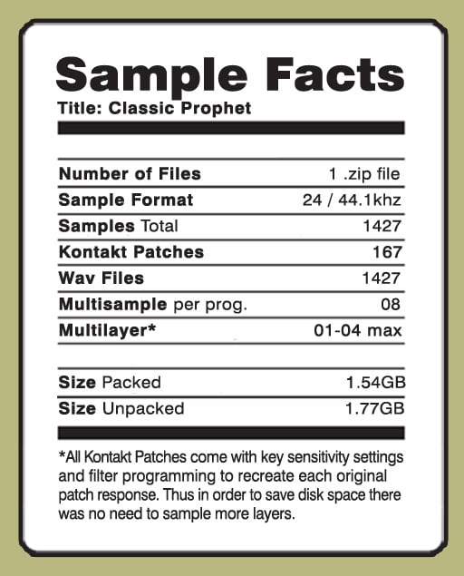 Based on the Sequential Prophet 5, this was the first popular polyphonic synth that took analog synthesis to the next level in the mid seventies. Capable to make a rich waveform palette, from warm pads to classic leads, strings and brass patches. The most usefull side of its classic sound as raw as possible. This library includes a distinctive selection of patches for the Native Instruments Kontakt Sampler. All instruments are multi-sample recorded at a crystal clear 24-bit stereo quality (also 16-bit version available). Every wav file was smoothly looped to save sample memory and loading time. More than 1.7GB of audio data including the most characteristic sound sampled from the Classic Prophet 5.