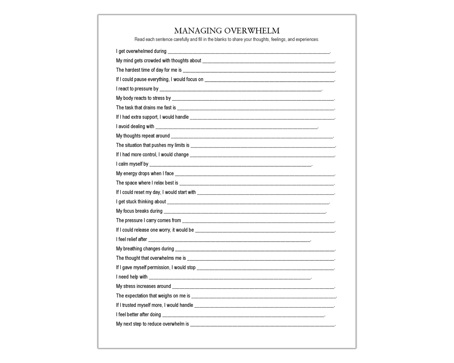 Start your day by letting go of the mental noise that keeps you stuck. This Managing Overwhelm worksheet features 30 prompts to help you identify what you can control and what you can let go. Use it for therapy sessions, journaling, or self-reflection to encourage you to be kind to yourself while you navigate your daily responsibilities. Trust your ability to handle what comes your way.