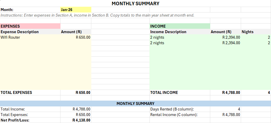 - Auto-calculated yearly totals, profit/loss, and occupancy rates