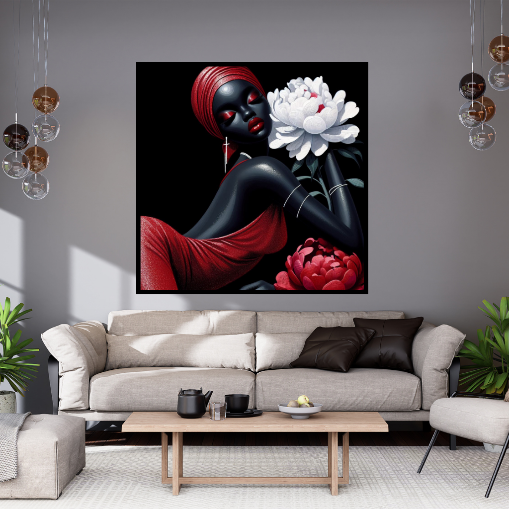 This stunning red and white print features a striking figure adorned in a chic dress. The contrasting colors and minimalist design create a captivating scene, inviting viewers to explore its depths.