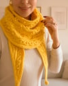 - Sample yarn, yellow shawl, large: DK Merino Superwash from Plymouth (100% fine sw merino, 130yds / 120m, 1.75oz / 50g) in color Sunshine
