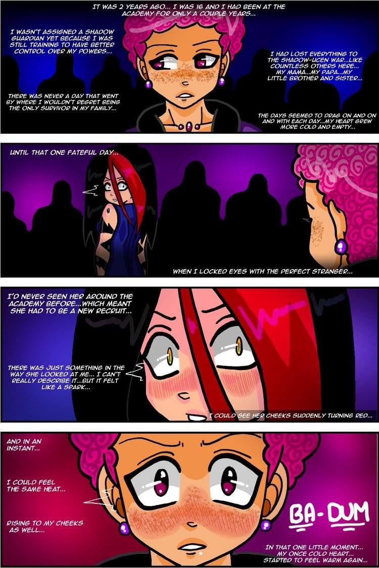 OLU was initially just supposed to be a spin-off series of Zee's very first comic series that she created back in 2013 called "Shadow Guardian" (which you can find on Webtoons). These fun and lovable characters that we know as Ruby and Rosa were first introduced in Volume 3 of that original series. But Zee fell so in love with their cute relationship dynamic that she thought they deserved a unique series of their own.
