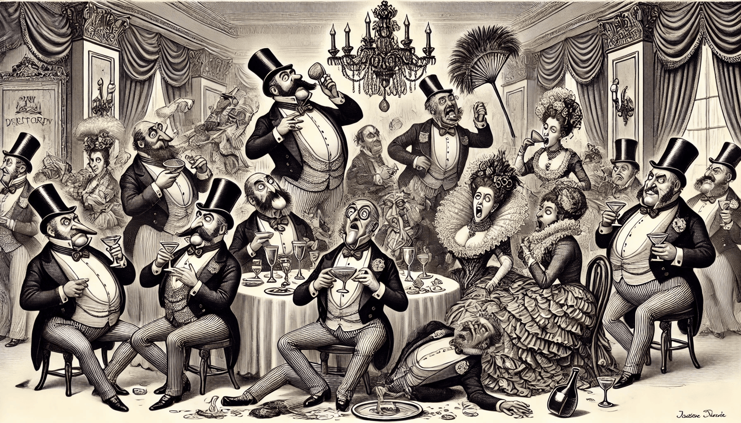 A brilliant and exaggerated caricature of Victorian high society, where elegance meets absurdity. This satirical illustration exposes the vanity, hypocrisy, and excess of the upper class through expressive, theatrical figures engaged in a lavish yet chaotic banquet. Perfect for admirers of Dickensian humor, Wildean wit, and the timeless critique of social pretensions.