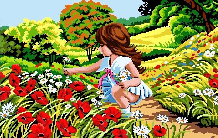 Girl Picking Red Wild Flowers - Cross Stitch PDF Downloadable Pattern