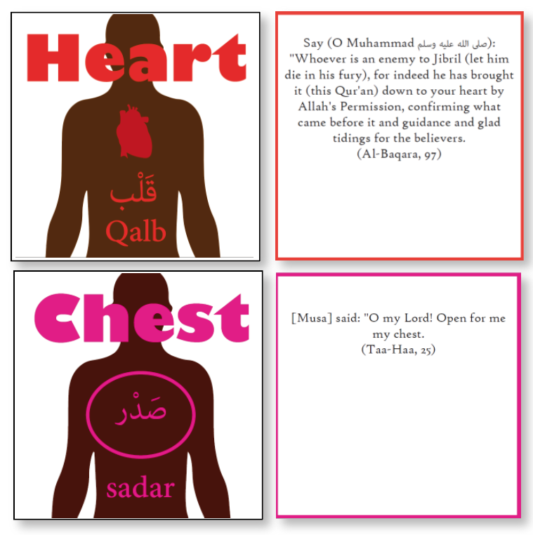 Join your child in understanding the Arabic language with our understanding the Noble Quran flashcards! Immerse yourselves in the language and elevate your Arabic skills effortlessly. Each flashcard is meticulously crafted, featuring carefully selected words from the Quran that relate to different body parts. With these flashcards, you'll not only deepen your understanding of the Quran but also enhance your grasp of the Arabic language. Don't miss out on this invaluable tool for spiritual growth and linguistic mastery. Start your journey today!