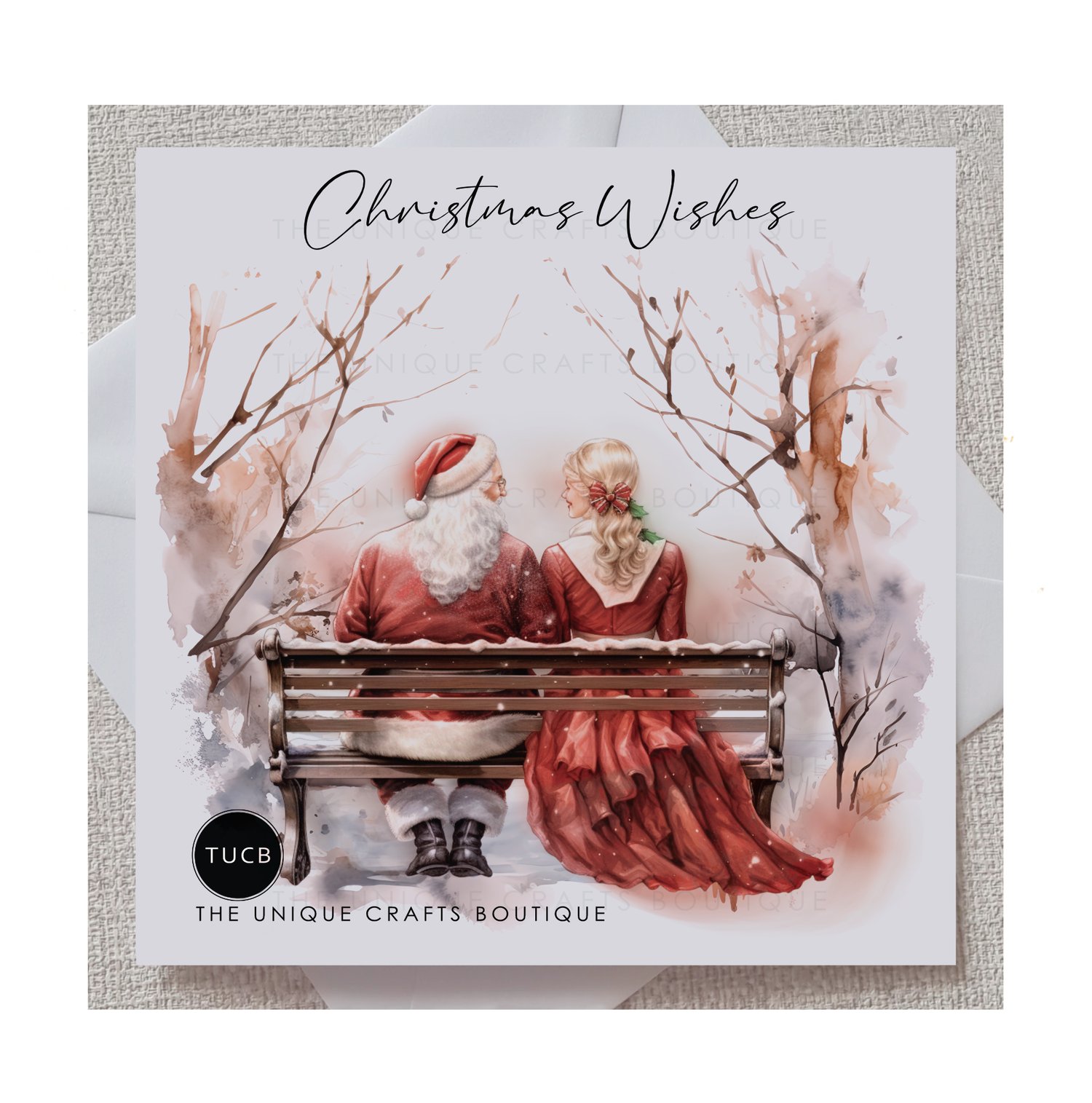 Printed with a beautiful traditional image of Mr and Mrs Claus sat together on a woodland bench 'Christmas wishes' is displayed above in a cute black text.