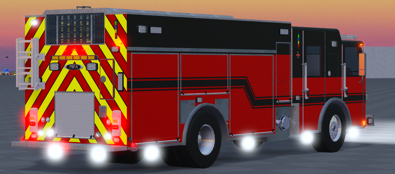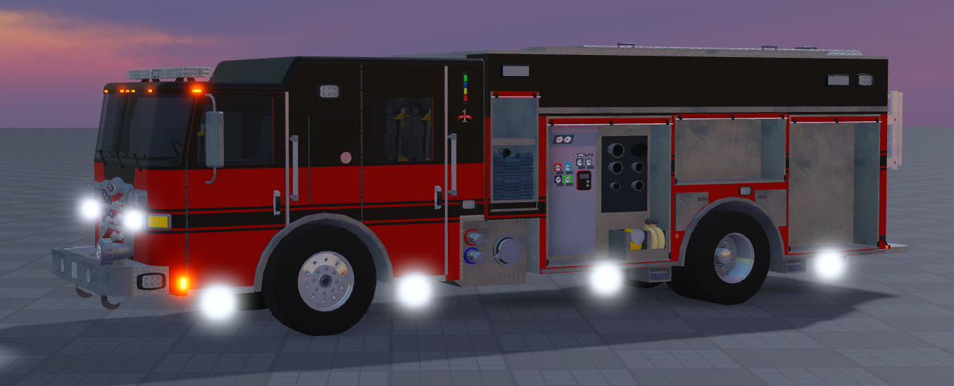 This truck is a Frontline Rapid Response Stock 2022 Pierce Enforcer PUC Engine. The vehicle is completely handmade using parts inside roblox studio. All the features work on the vehicle including the doors, compartments, ELS, and chassis. The truck is on Firestone chassis and does not have a UVMAP. Recolor of the apparatus or striping will have to be done by hand. Model is equipped with two interior medical cabinet that can be accessed from inside and outside the cab.