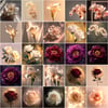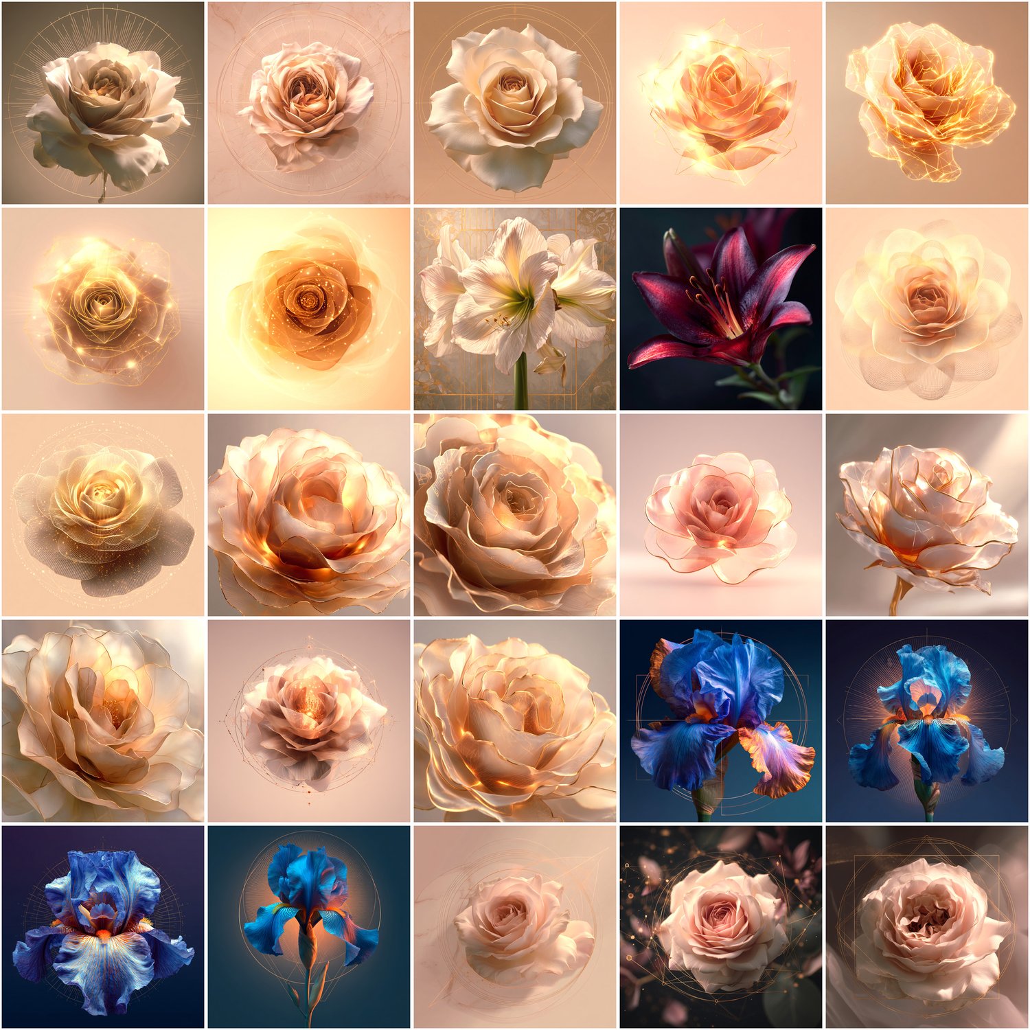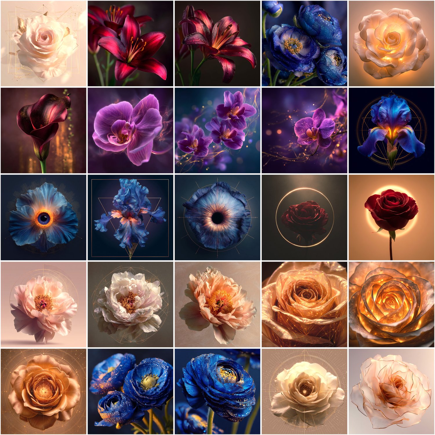 This bundle explores depth, light, color and symbolism through powerful botanical compositions — from soft ivory and champagne tones to rich violet, sapphire blue and deep garnet red. Each piece blends realism, elegance and subtle sacred elements without becoming kitsch or overly dramatic.