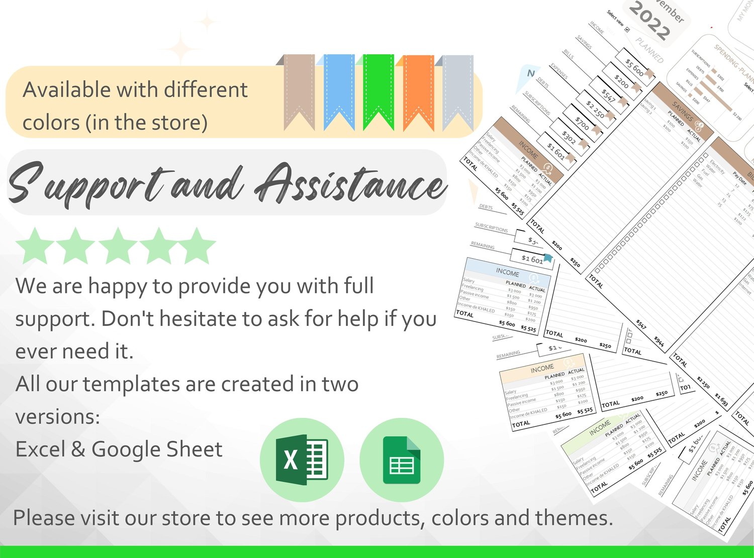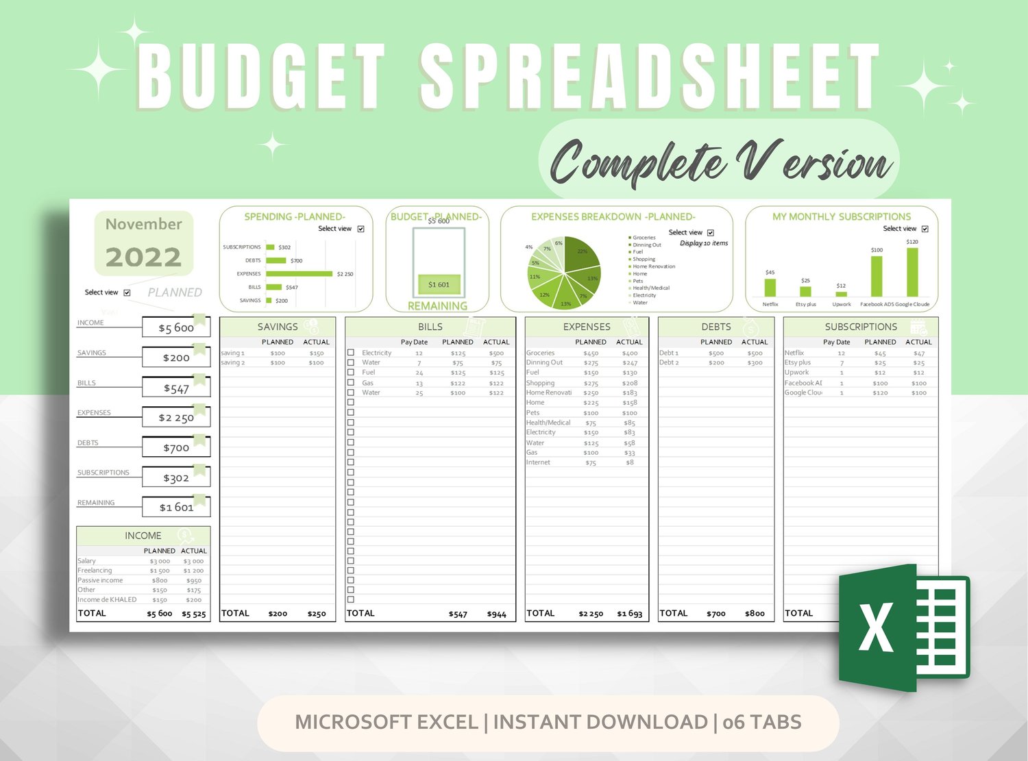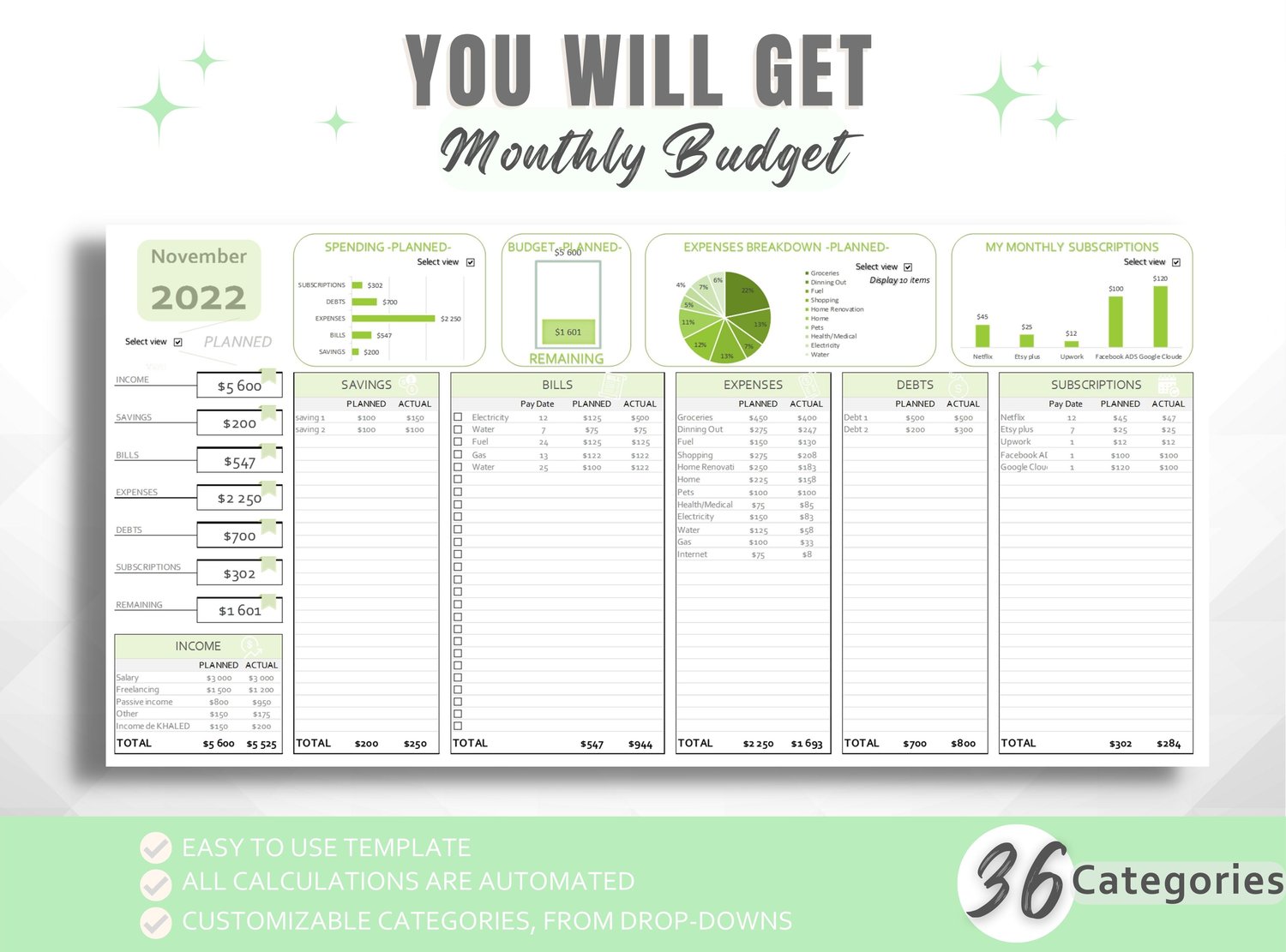 - Monthly Budget in which you fill your PLANNED : incomes, debts, savings, expenses, Bills and subscriptions