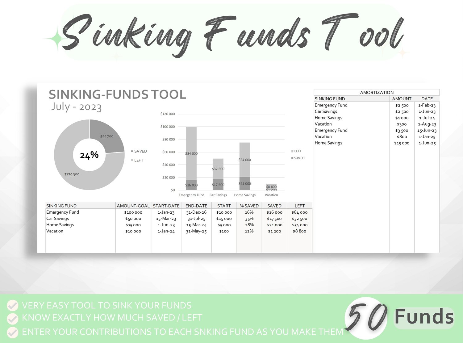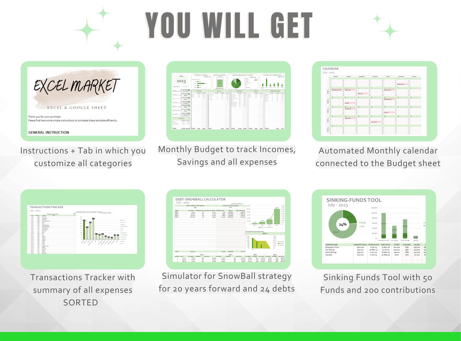 Green Monthly Budget + Debt snowball+Calendar+Sinking Funds