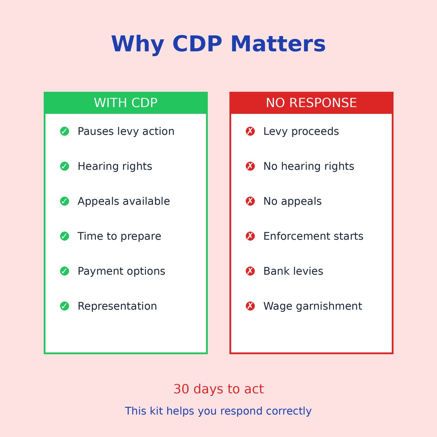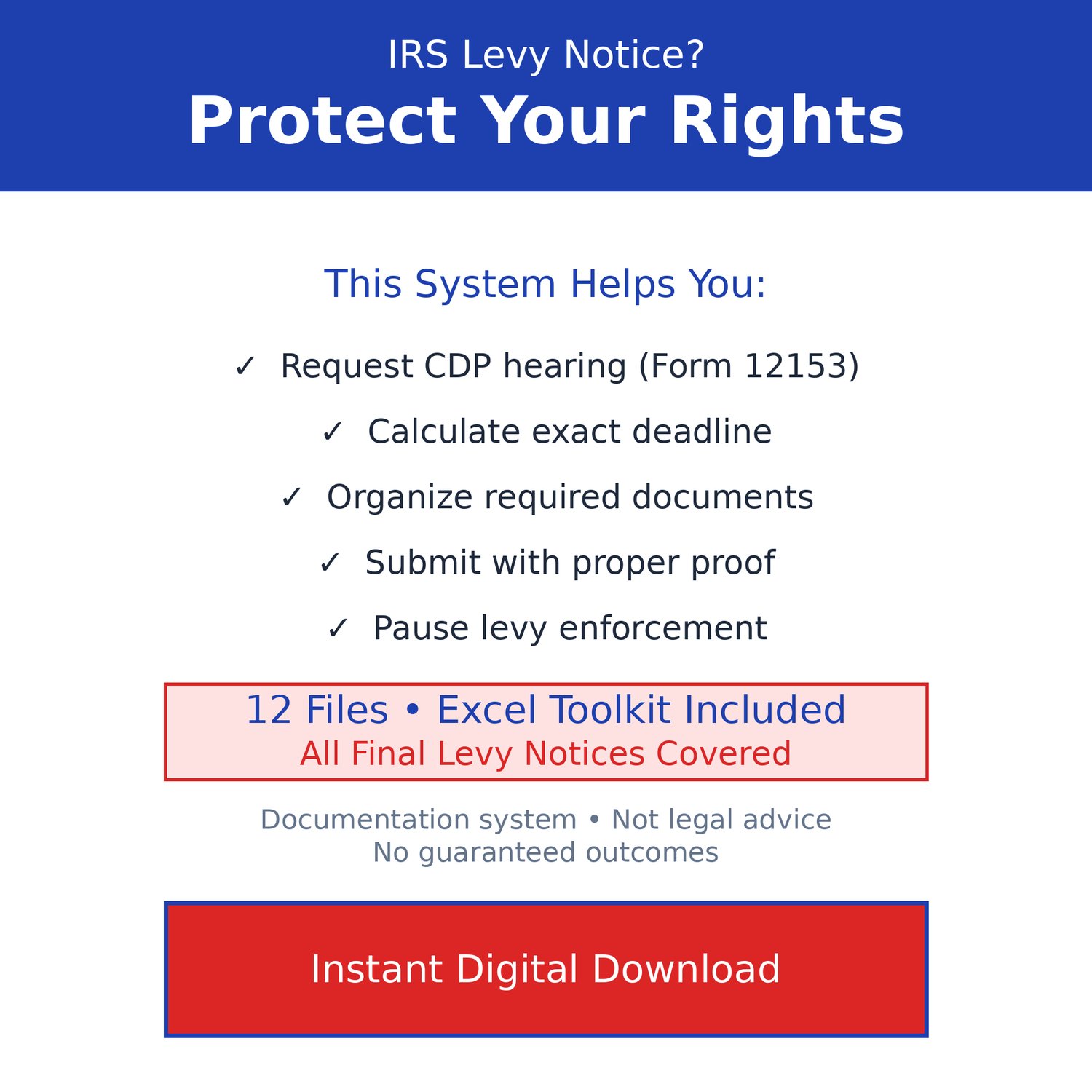 If filed within the required 30-day window, a timely CDP request generally suspends levy action while your case is reviewed.